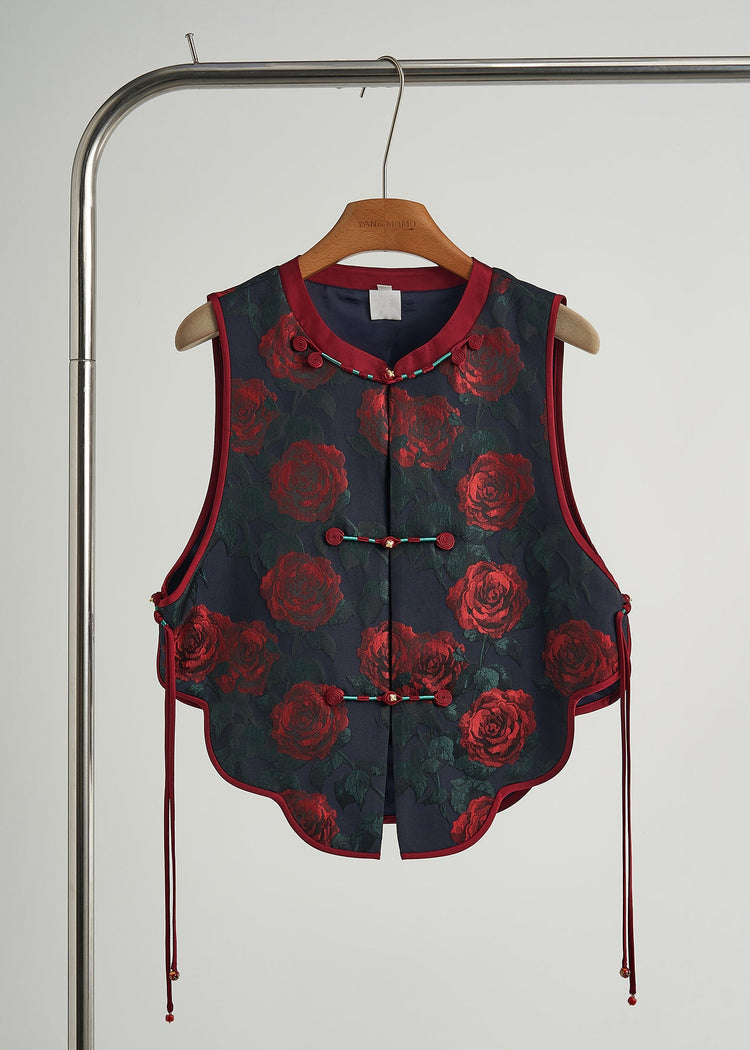Elegant Black Chinese Button Floral Jacquard Silk Vests Fall