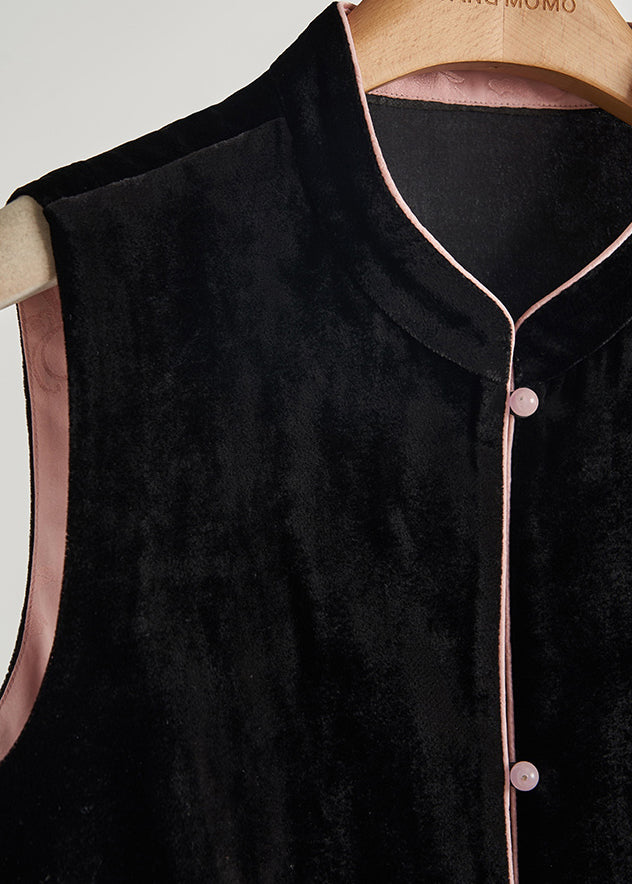 Fine Black Mandarin Collar Patchwork Flower Silk Velour Tops Fall