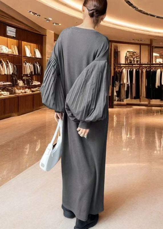 Boho Grey Oversized Patchwork Cotton Dress Lantern Sleeve