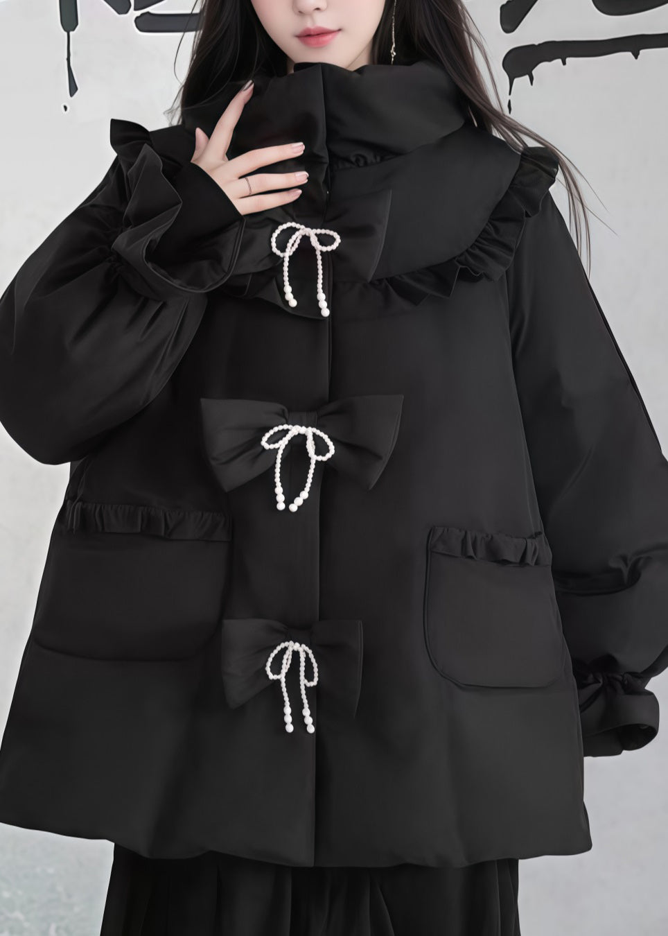 Chic Black Ruffled Pockets Patchwork Fine Cotton Filled Puffers Jackets Winter