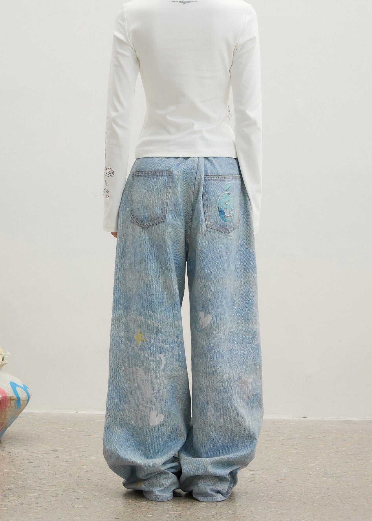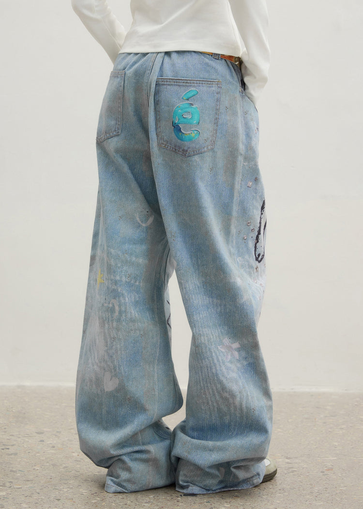 Original Design Blue Cartoon Print Zircon Denim Pants Spring