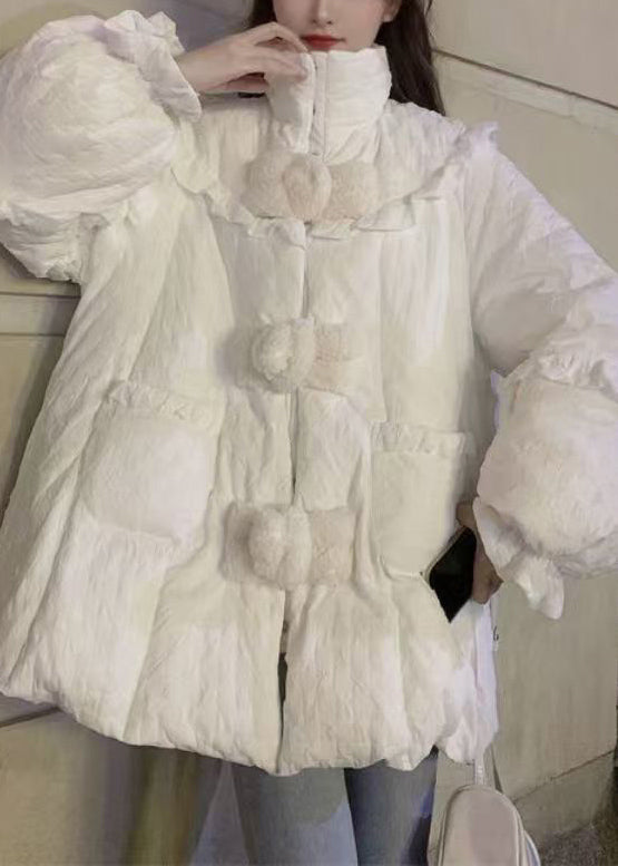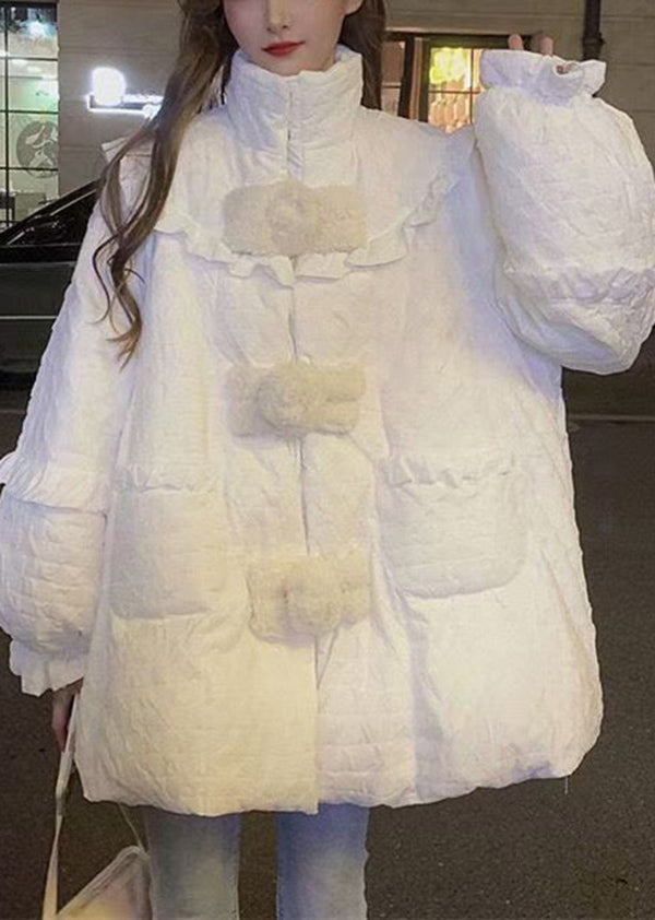 Plus Size White Ruffled Pockets Patchwork Fine Cotton Filled Coats Winter