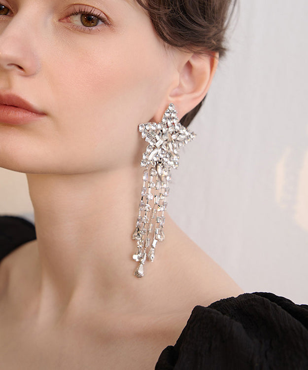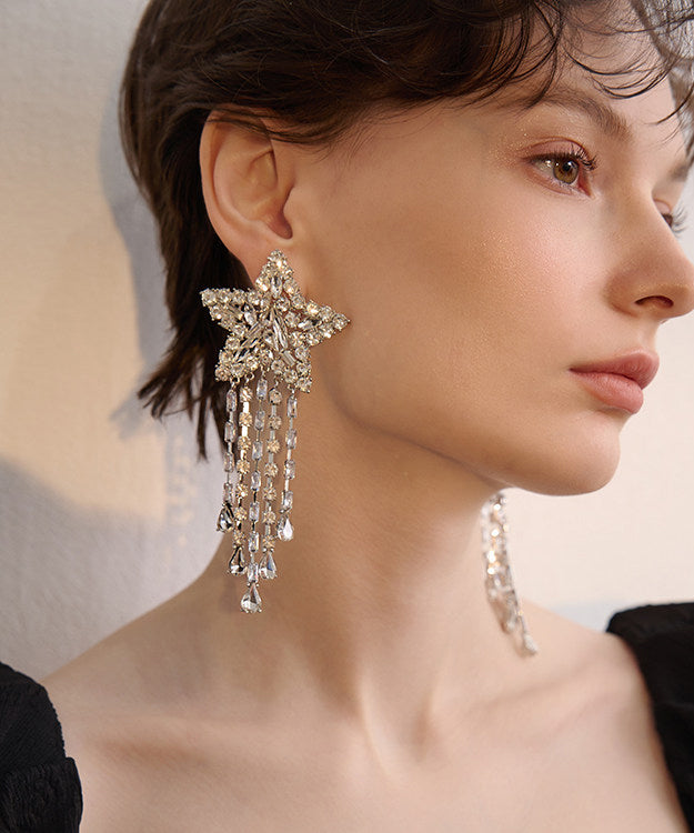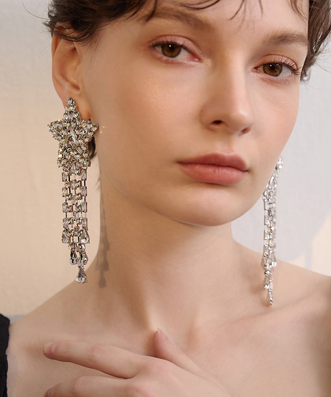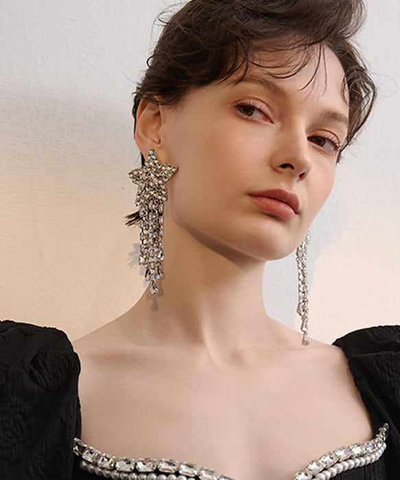 Exaggeration Silk Zircon Five Pointed Star Tassels Silver Plated Stud Earrings