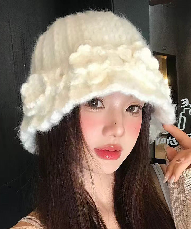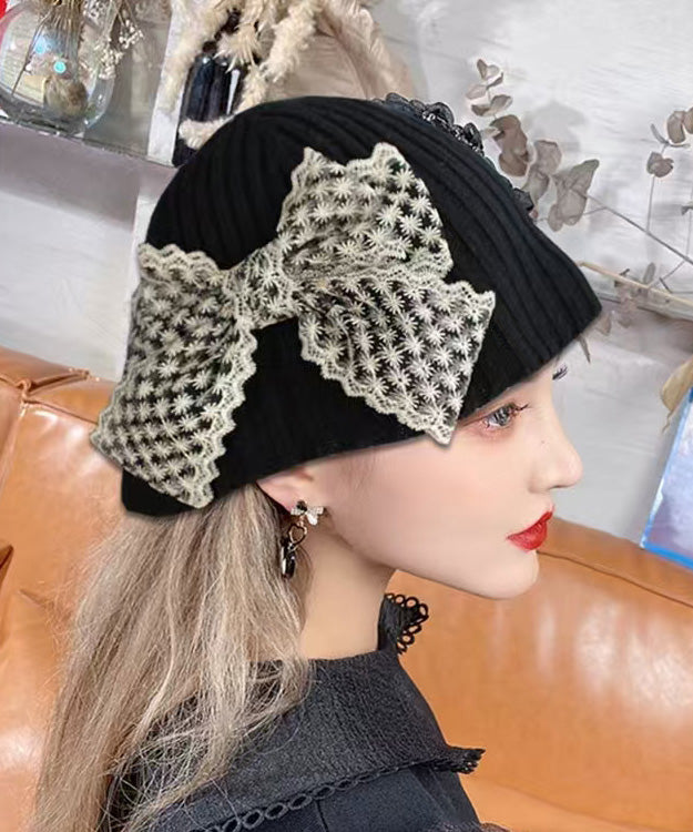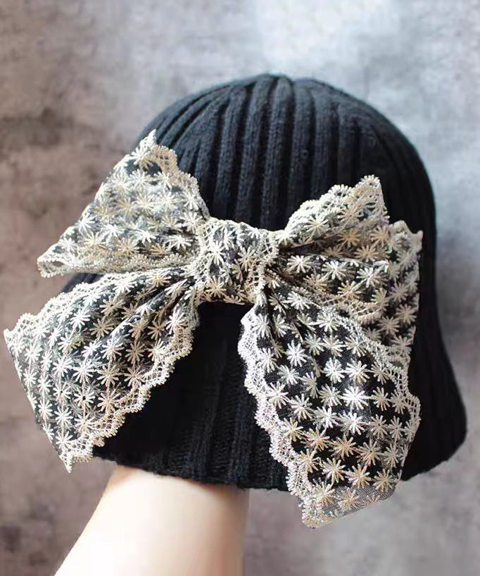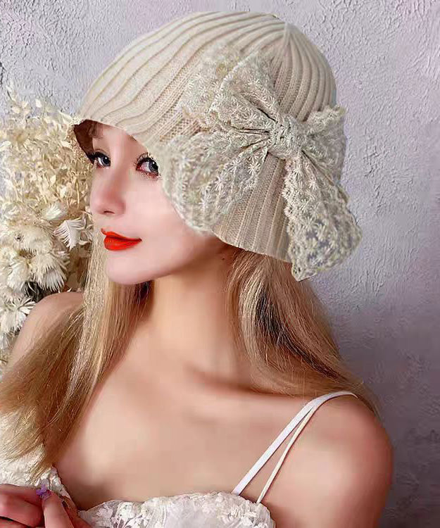 New Sweet Beige Lace Bow Knitted Bucket Hat