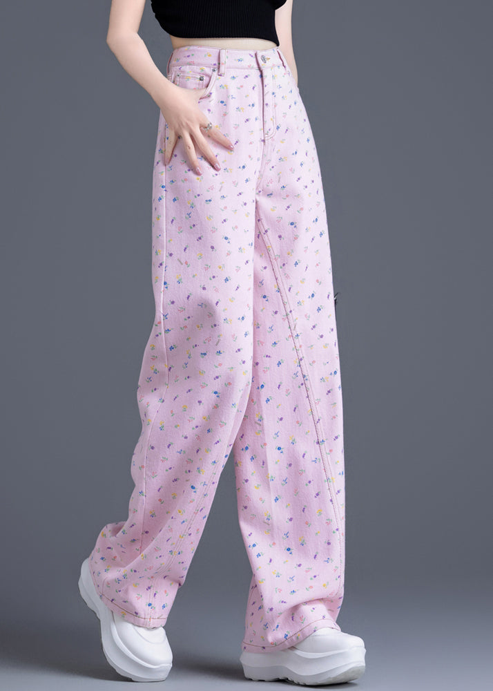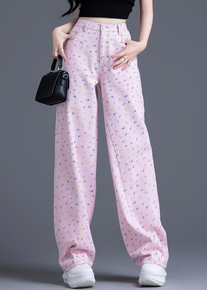 Fashion Pink Pockets Print Denim Straight Pants Spring
