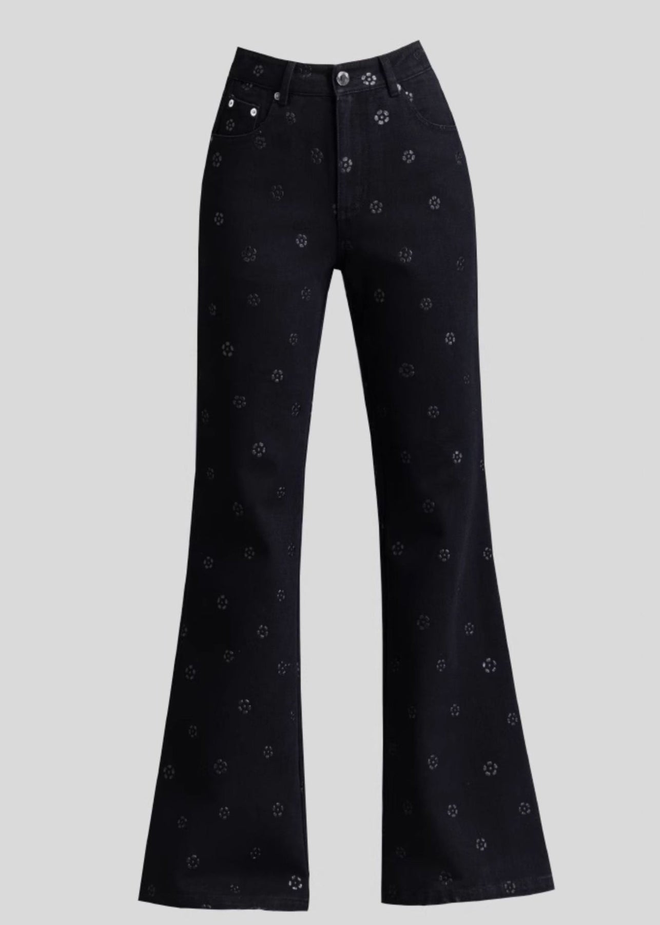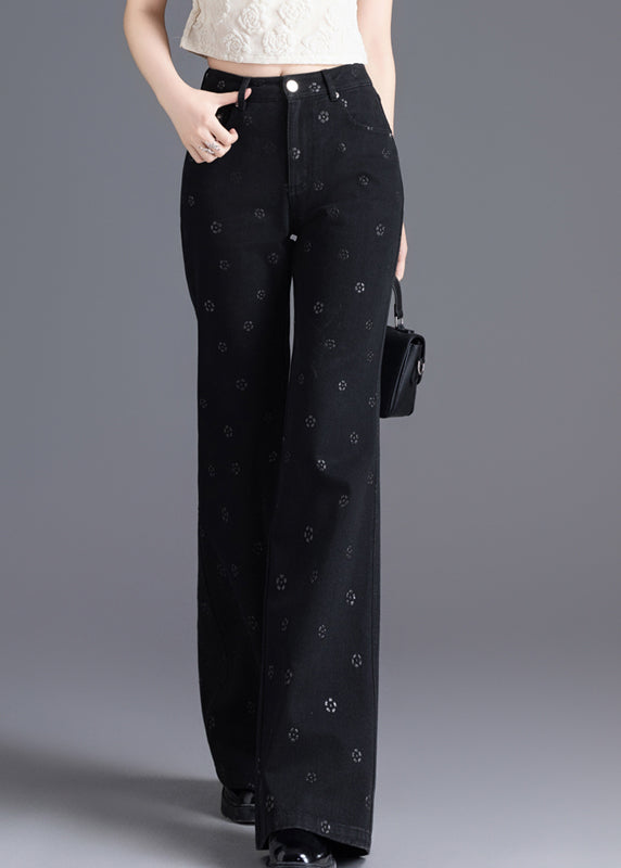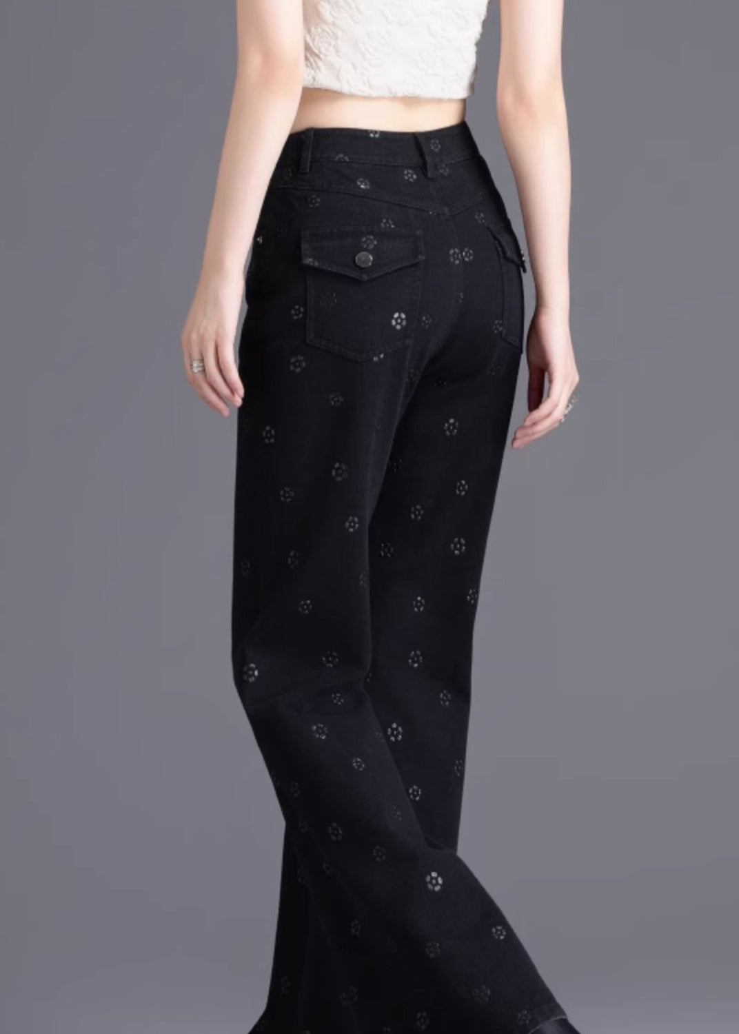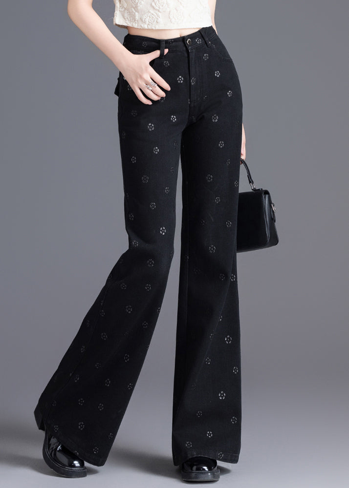 Slim Fit Black Pockets Print Denim Flared Trousers Spring