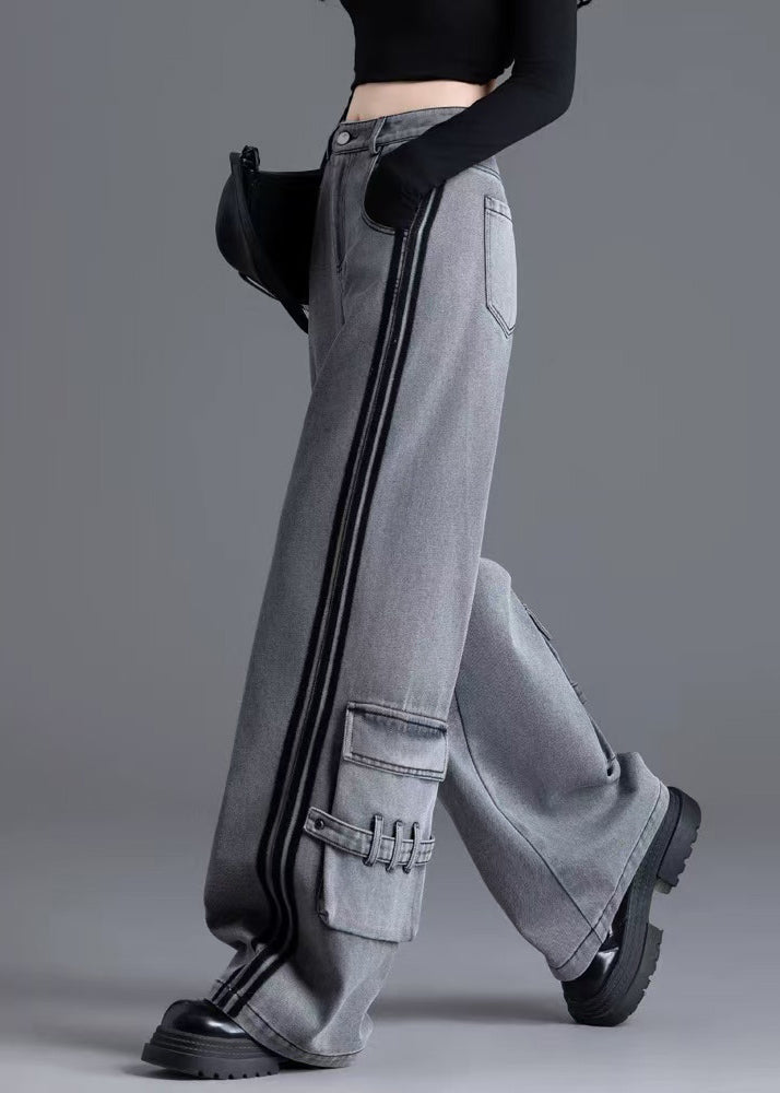 Women Black Pockets Patchwork High Waist Denim Pants Spring