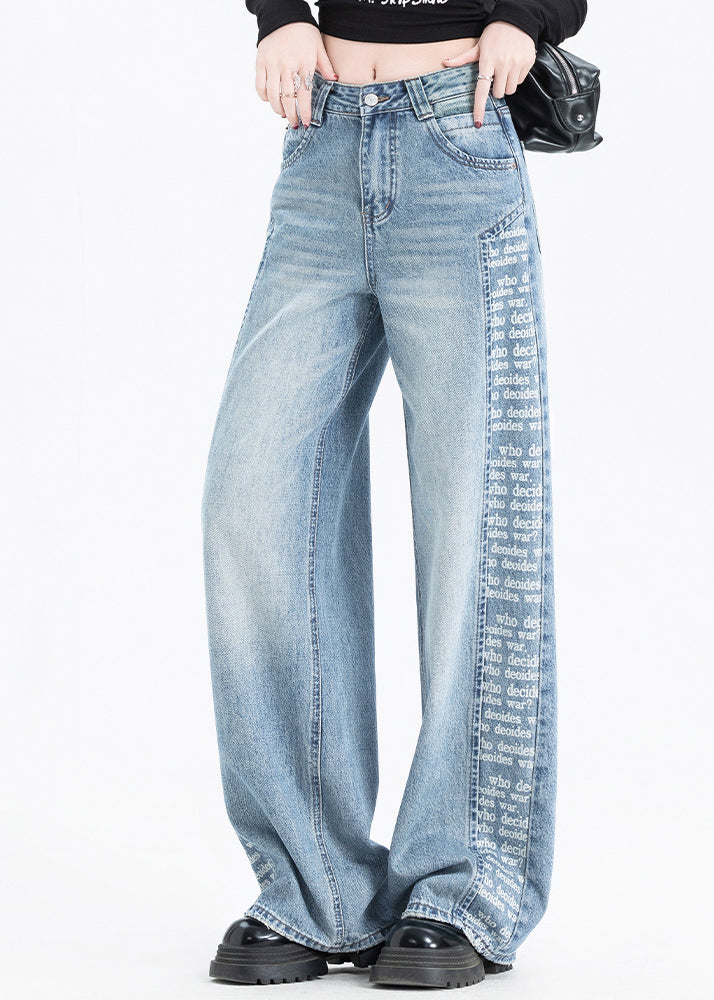 Women Blue Pockets Print Patchwork Denim Pants Spring