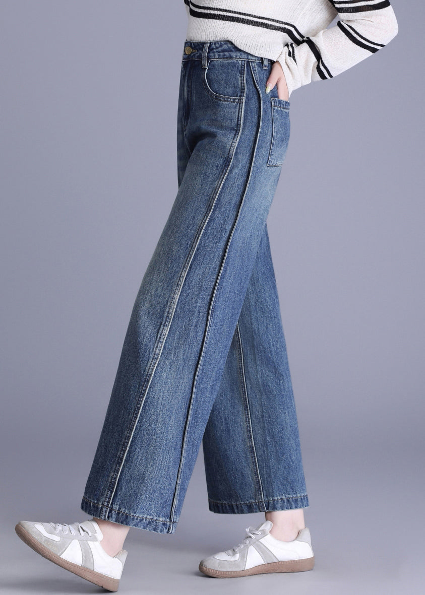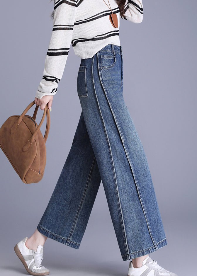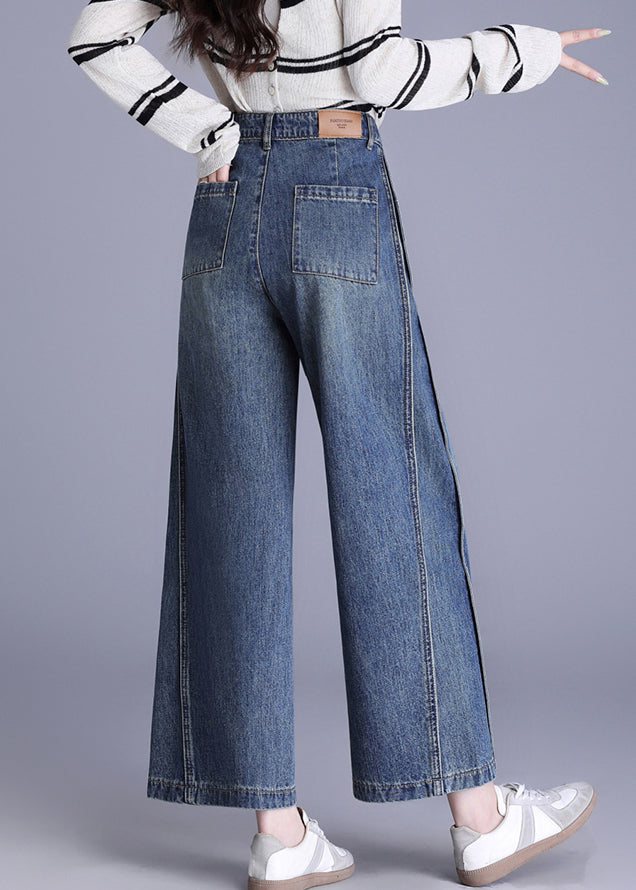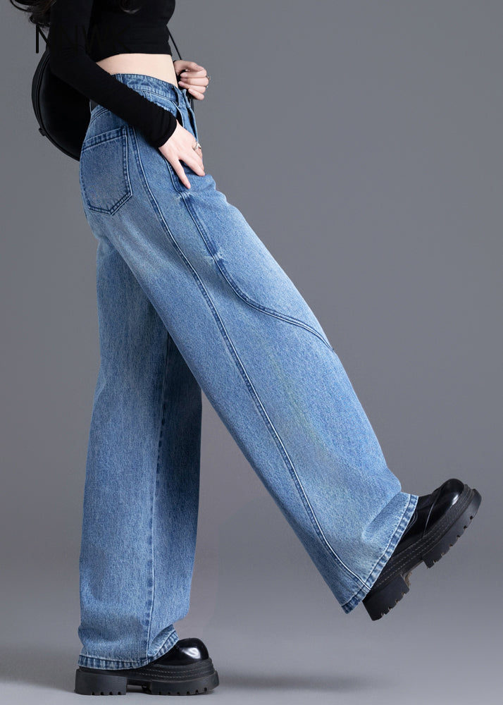 French Blue Oversized Pockets Denim Straight Pants Spring