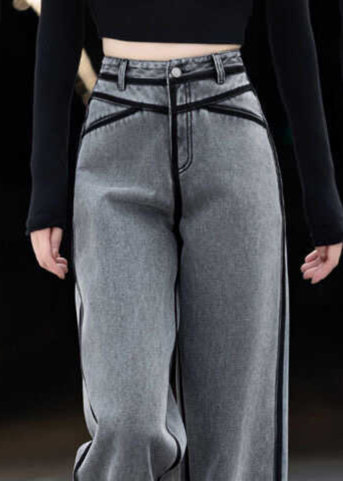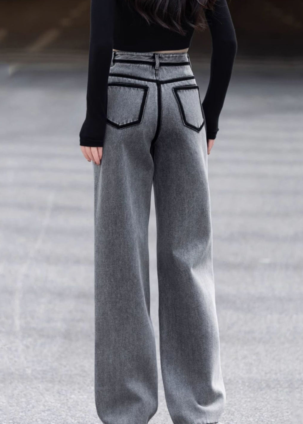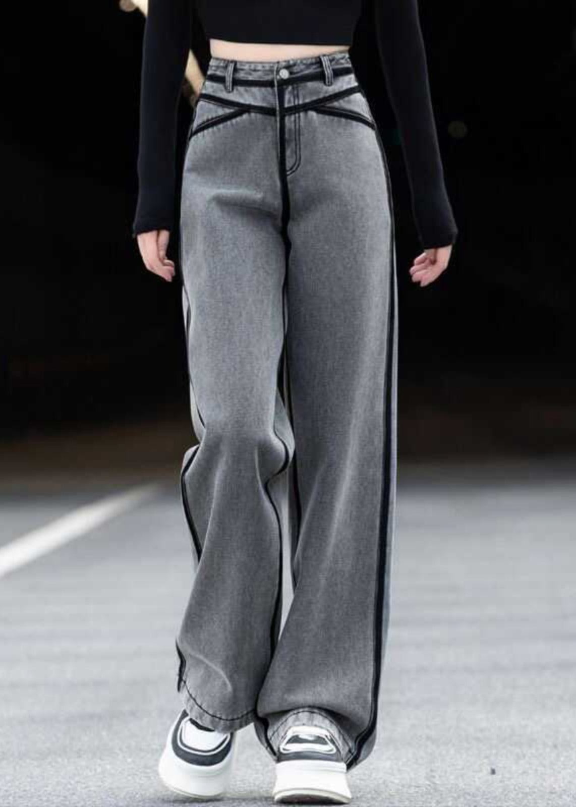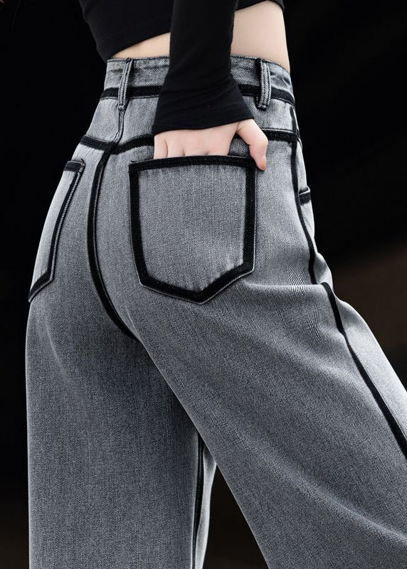 New Grey Pockets Striped Patchwork Denim Pants Spring