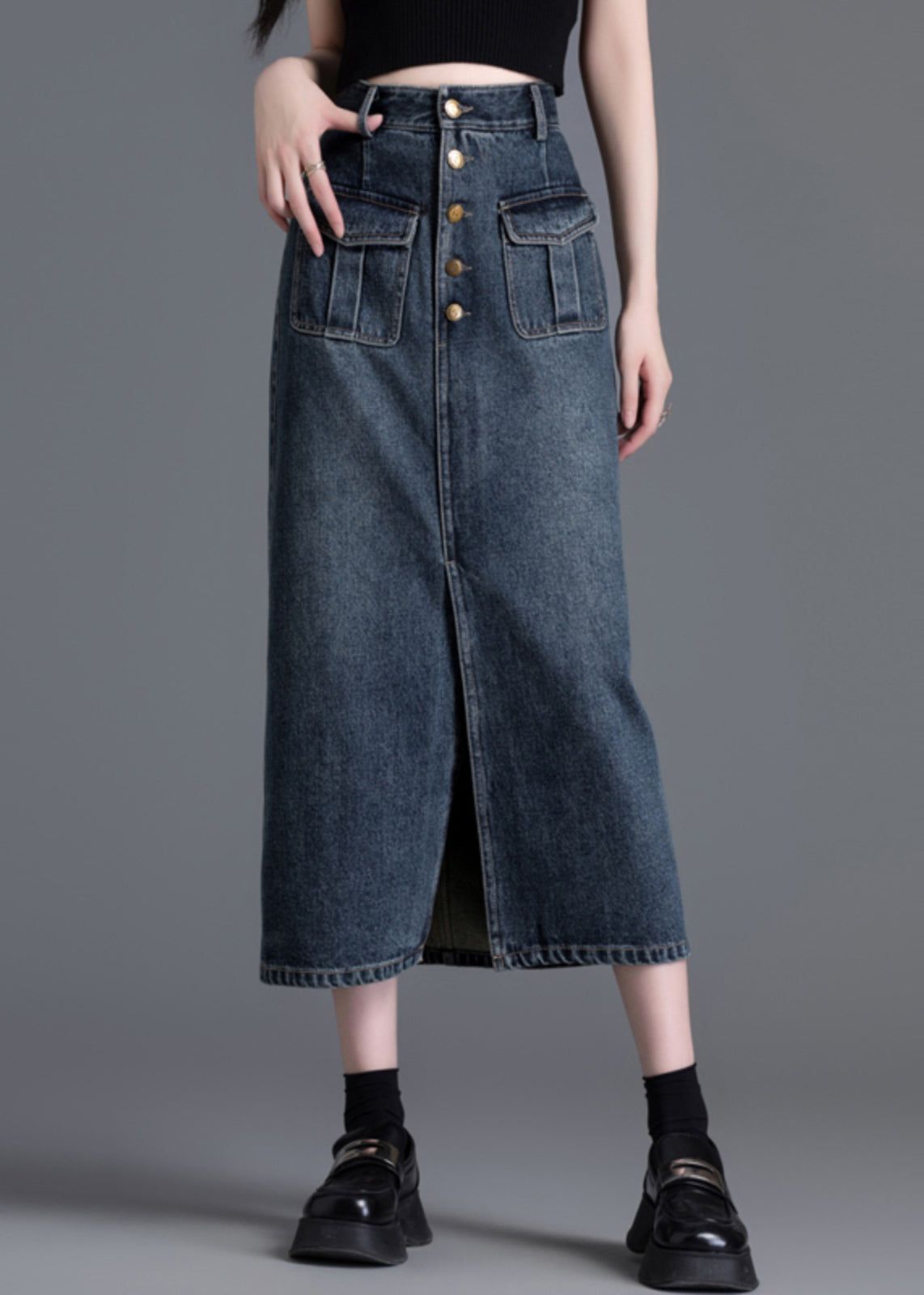 Silm Fit Navy High Waist Side Open Denim Straight Skirt Spring