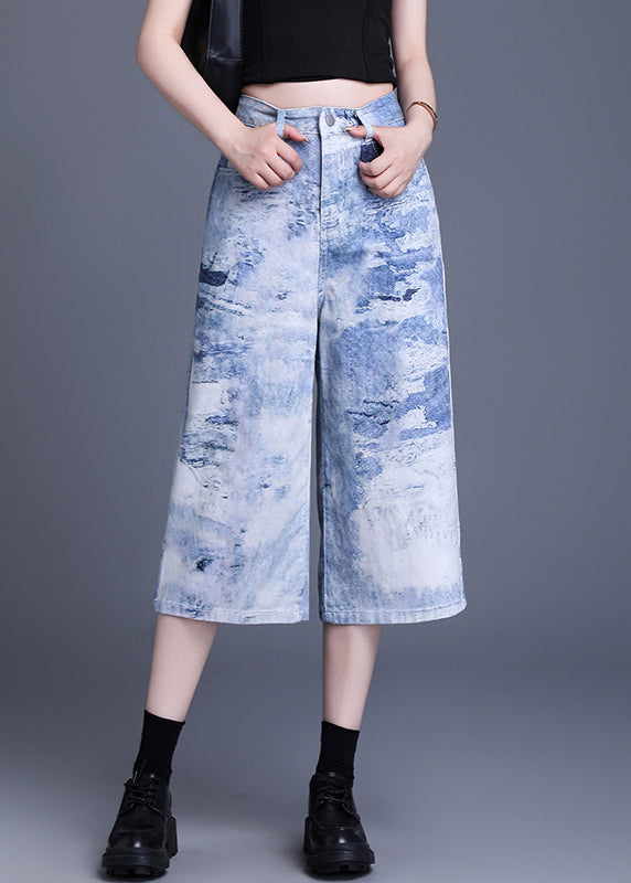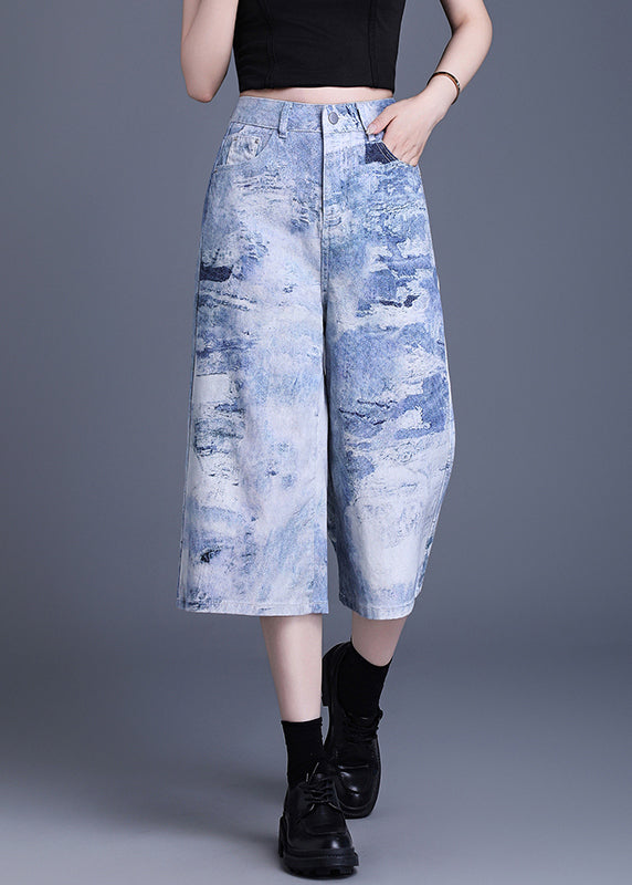 Organic Blue Pockets Print Denim Wide Leg Pants Spring