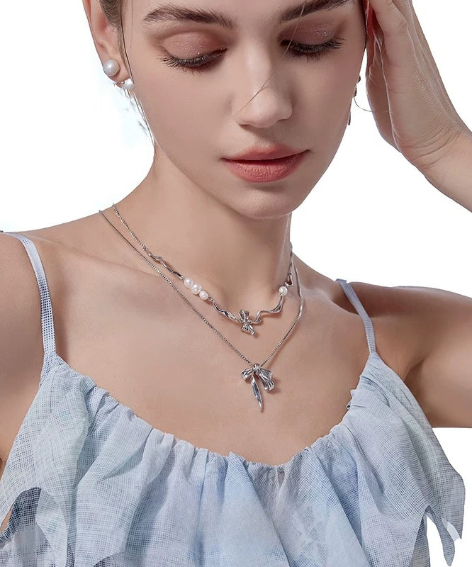 Chic Silk Alloy Pearl Bow Pendant Necklace Two-Piece Set