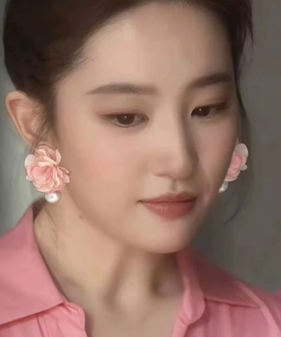 Cute Pink Cloth Pearl Floral Stud Earrings