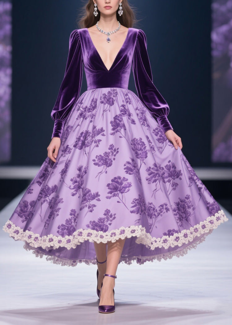 Purple Solid Silk Velvet Patchwork Print Lace Floral Long Dress V Neck Spring