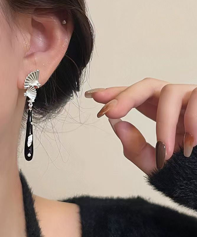 Chinese Style Black Copper Dripping Glaze Sector Drop Earrings