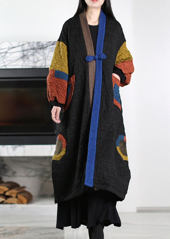 Art Black Chinese Button Patchwork Fine Cotton Filled Trench Winter