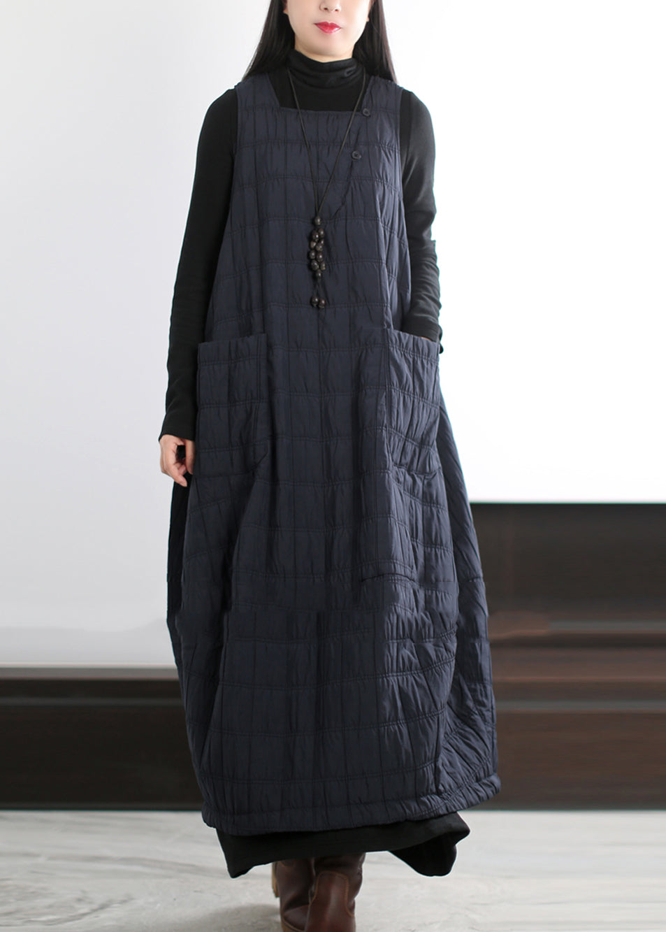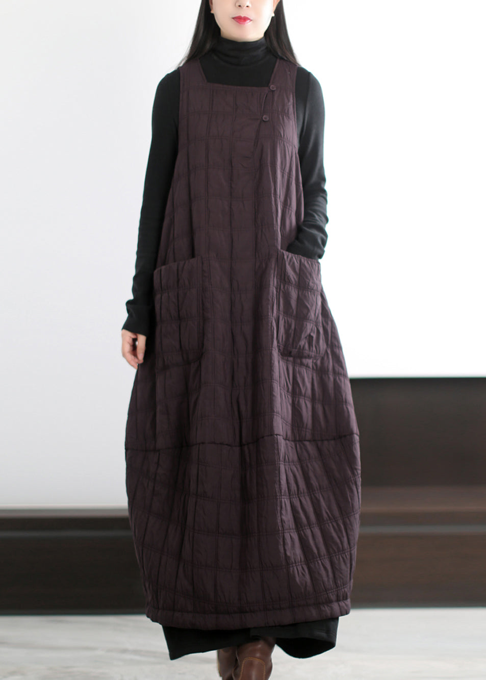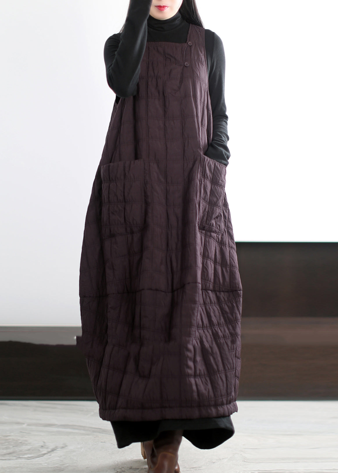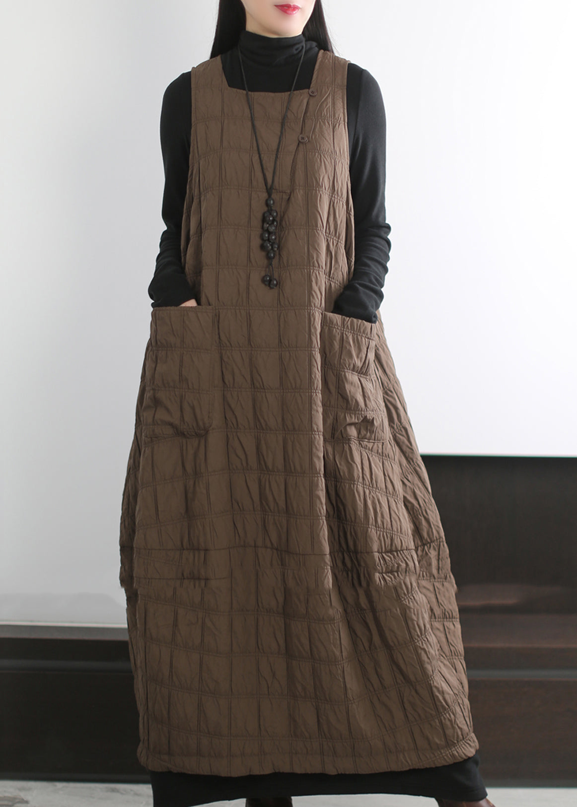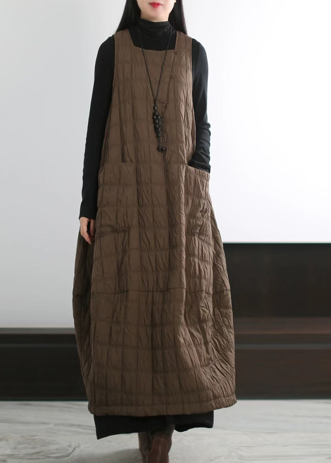 Chic Coffee Oversized Pockets Fine Cotton Filled Long Dress Winter