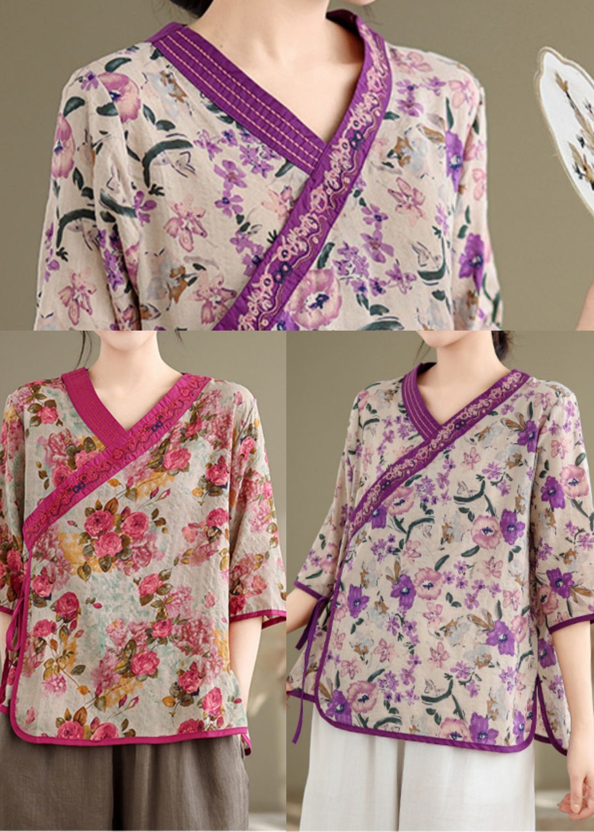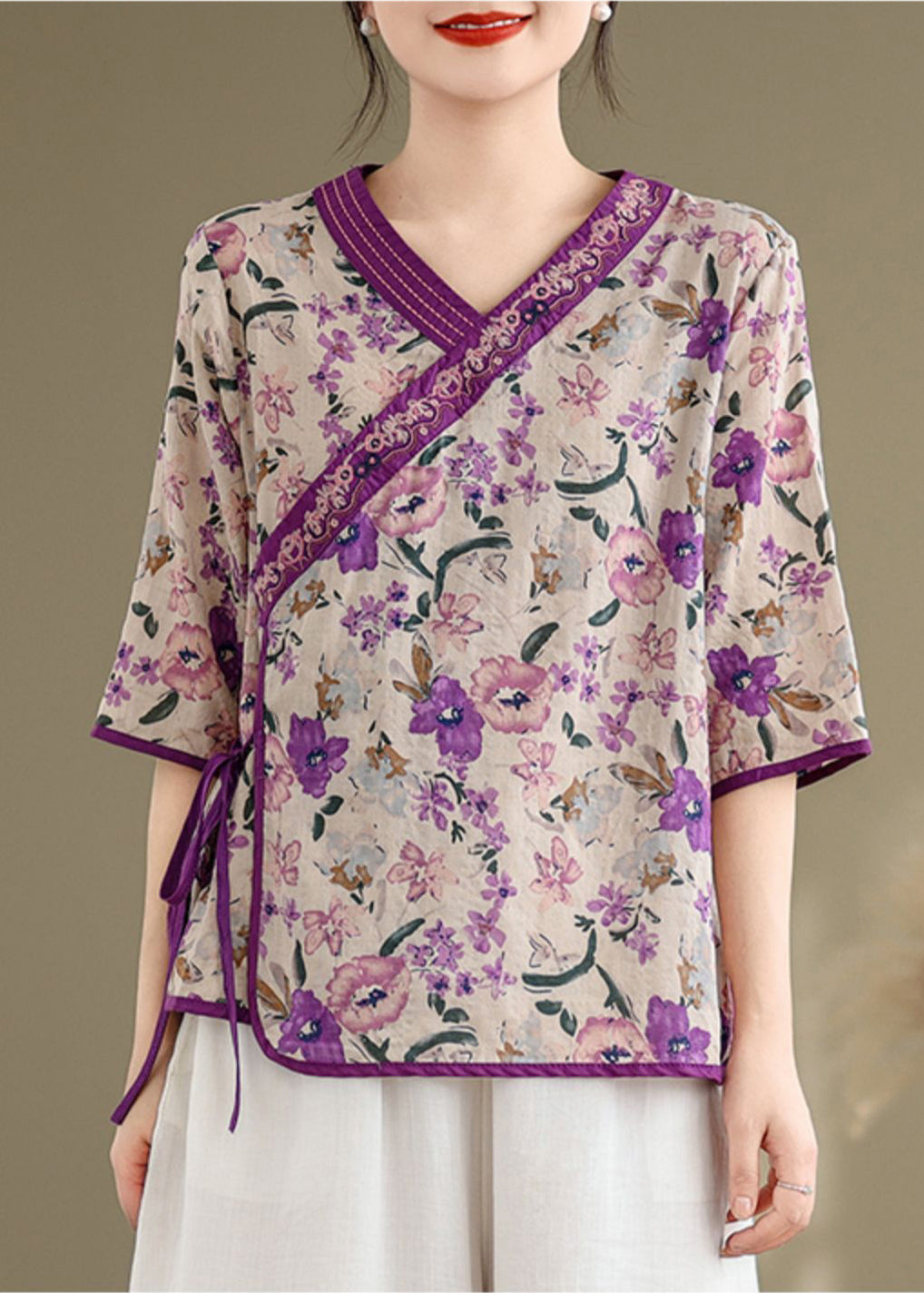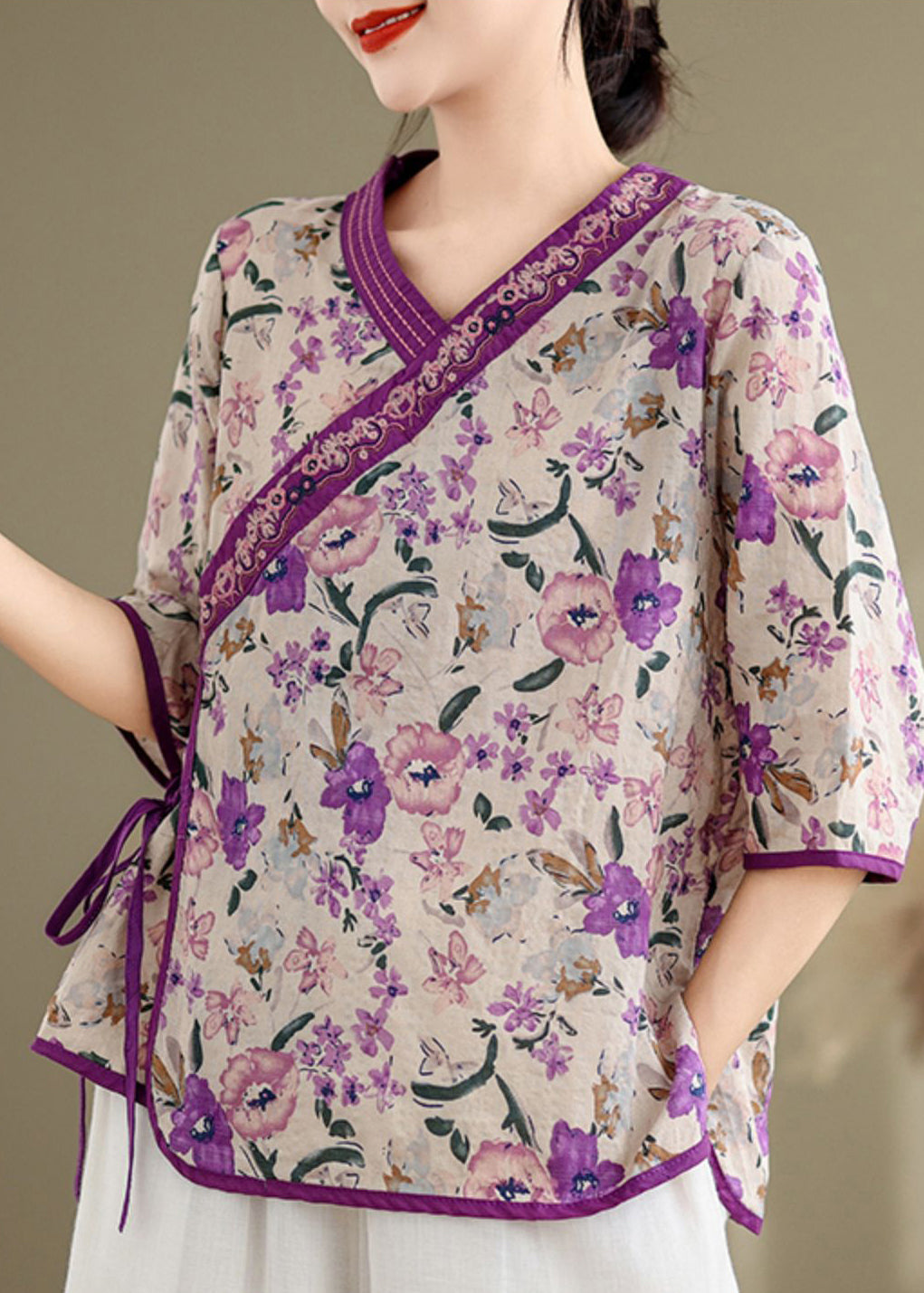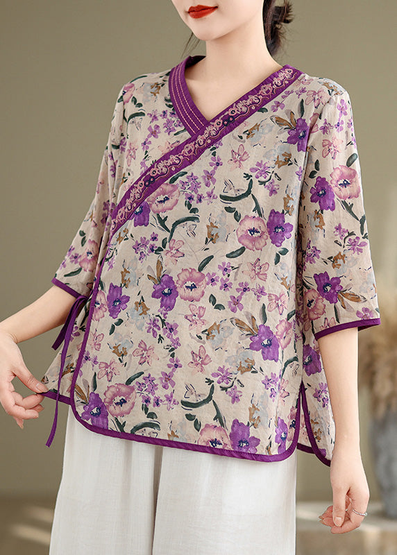 Handmade Purple Embroidered Print Linen Shirt Top Half Sleeve