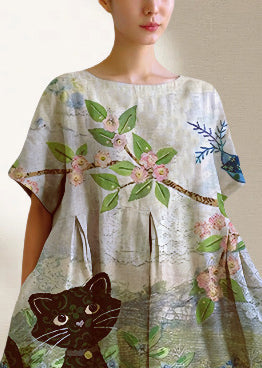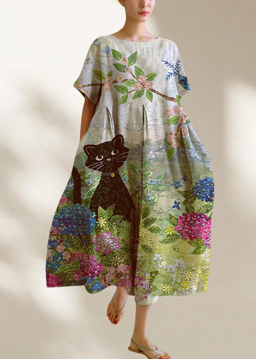 Natural Oversized Cats Print Cotton Long Dress Summer