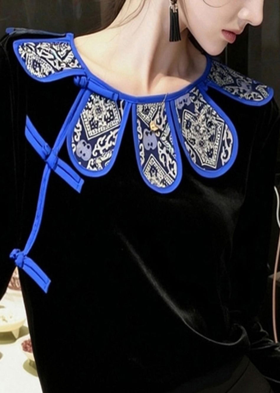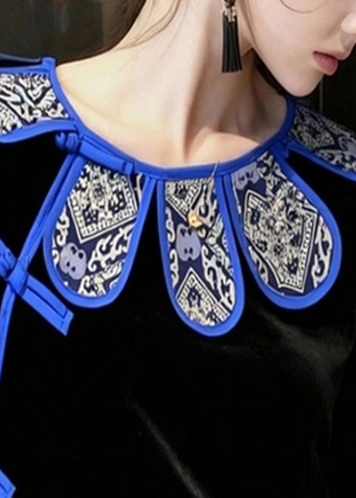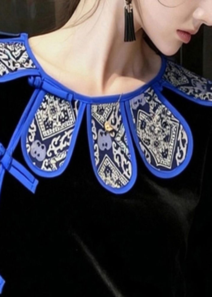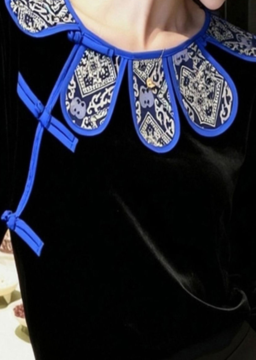 Vintage Black Chinese Button Silk Velour Oriental Shirts Spring