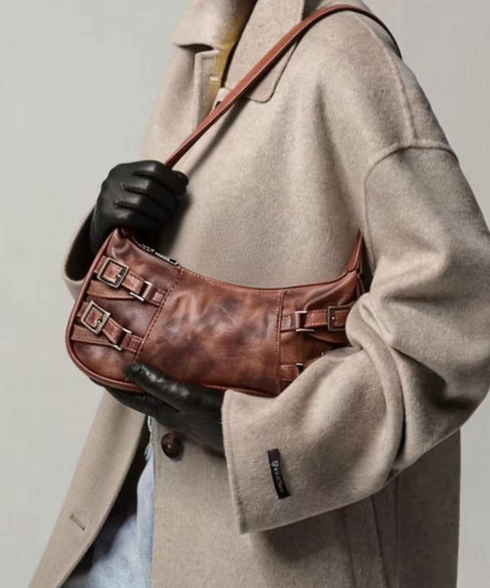 Elegant Brown Appliqued Rivet Faux Leather Shoulder Bags