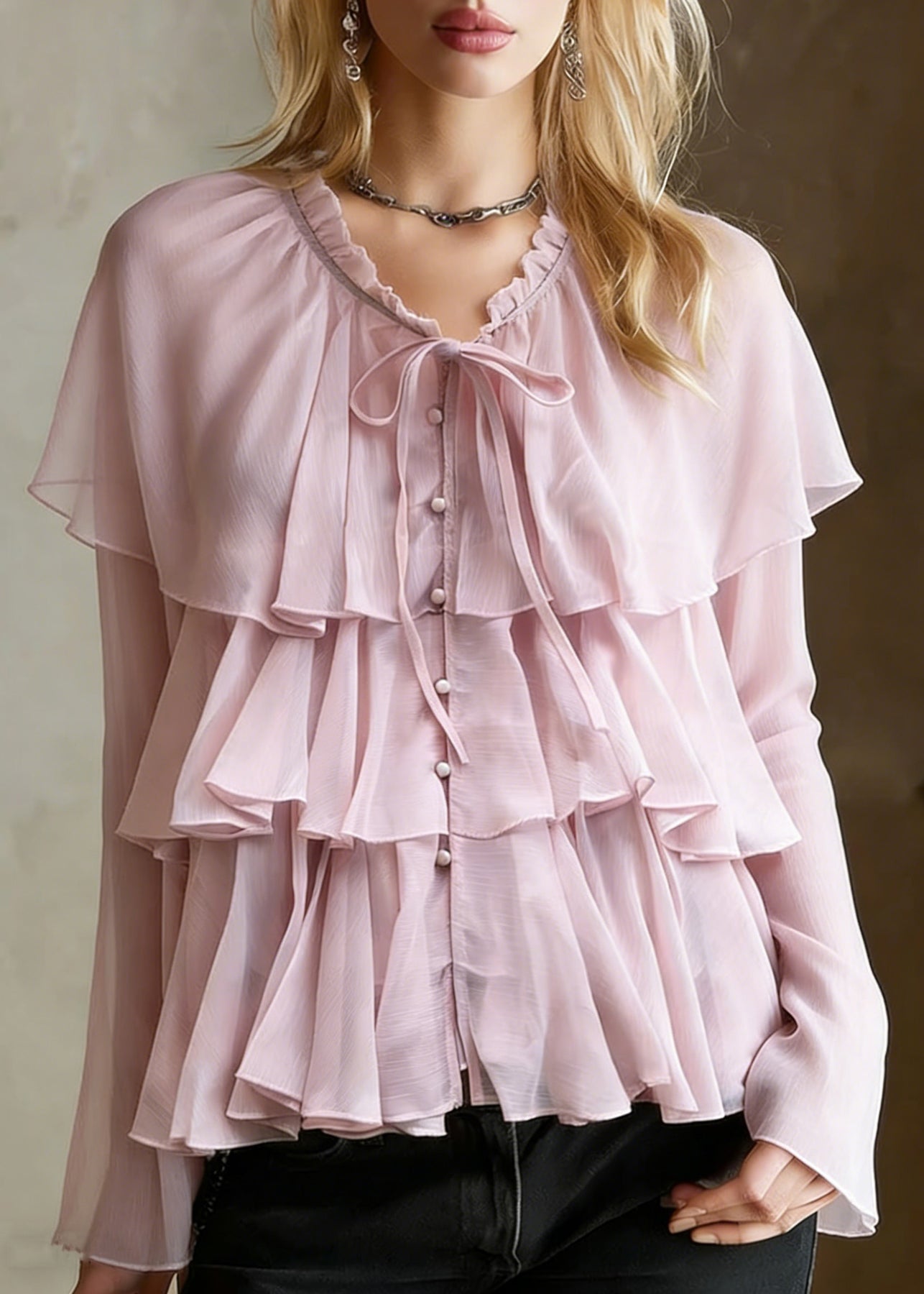 Pink Button Lace Up Cotton Blouses Ruffled Spring