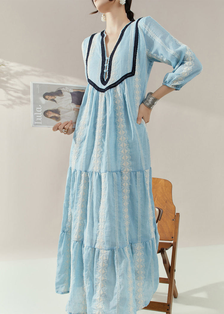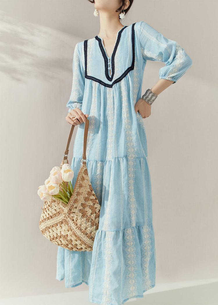 Elegant Blue V Neck Print Cotton Holiday Dress Half Sleeve