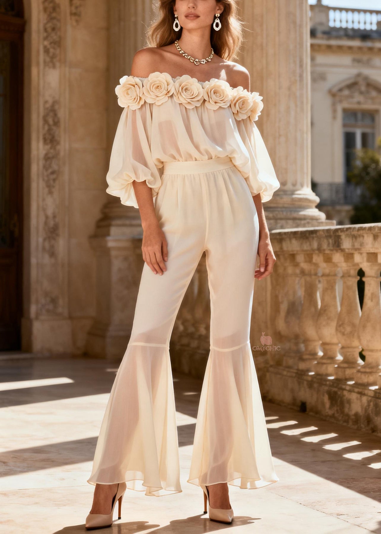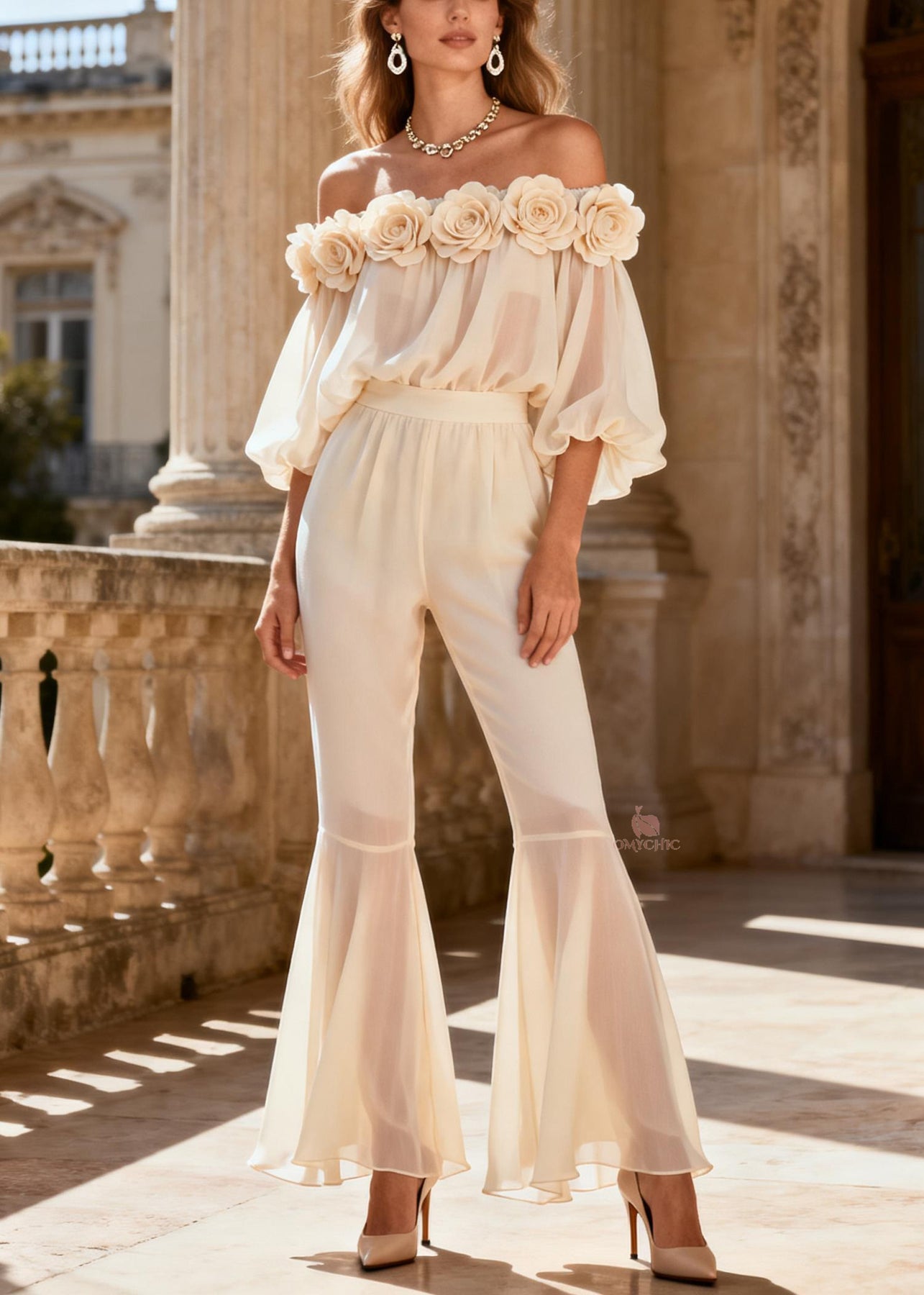 Vogue White Floral Chiffon Shirts And Flared Trousers Two Piece Set Spring