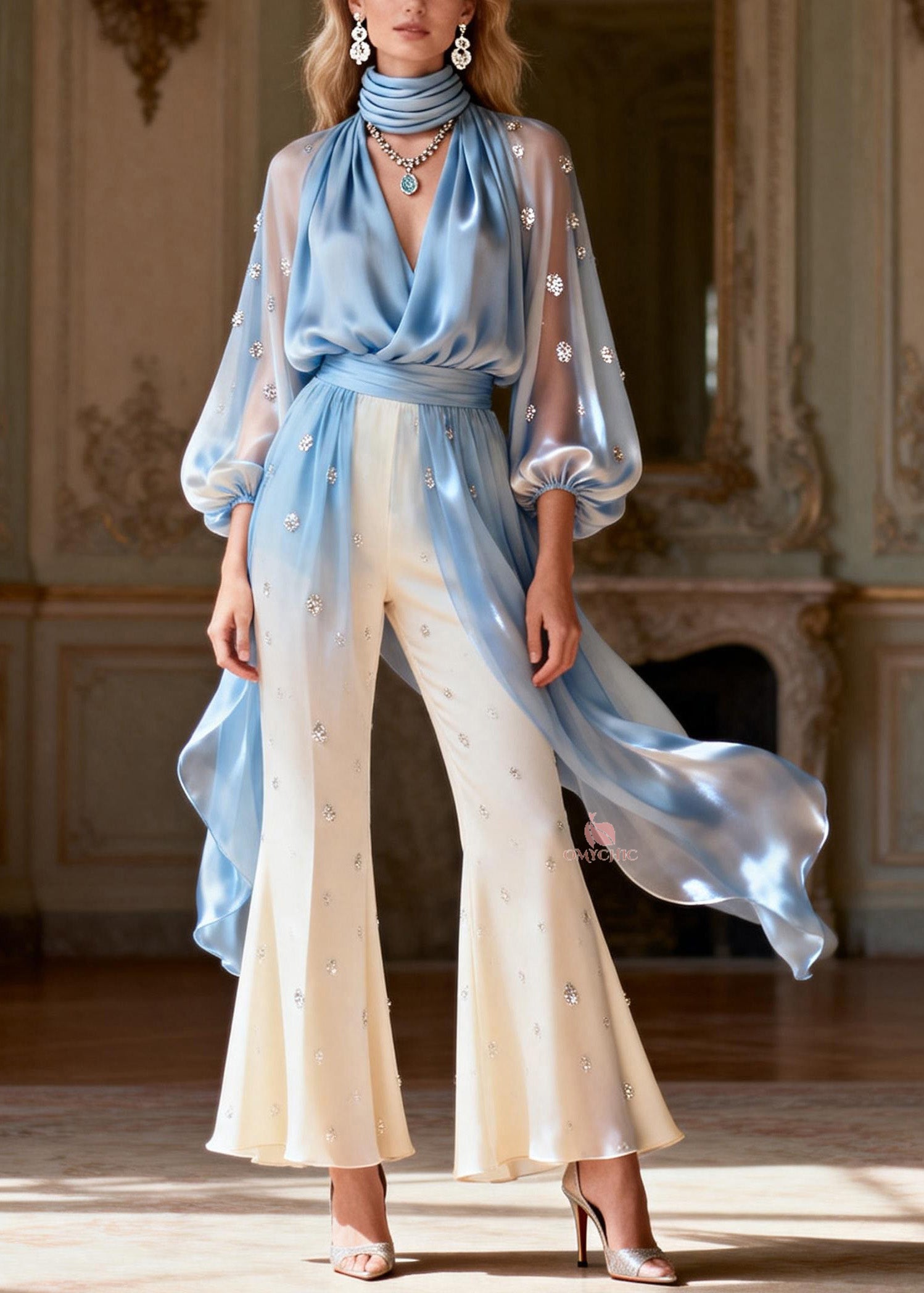 Stylish Blue O-Neck Silk Top And Flared Trousers Two Pieces Set Lantern Sleeve