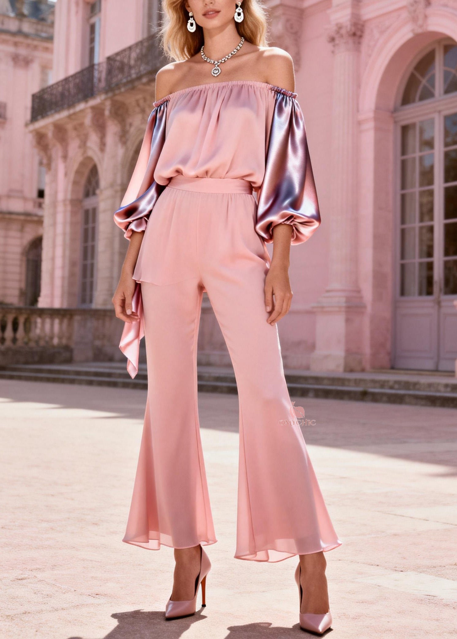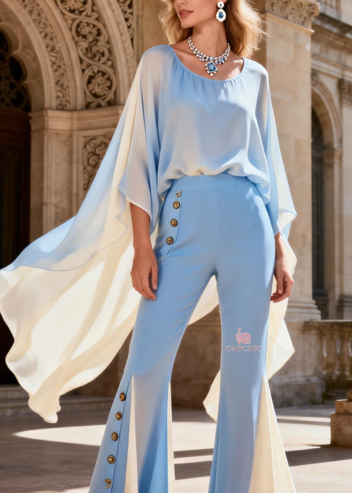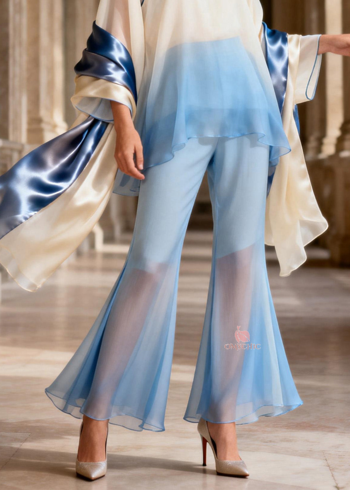Gradient Color Slash Neck Print Chiffon Top And Flared Trousers Two Pieces Set Long Sleeve