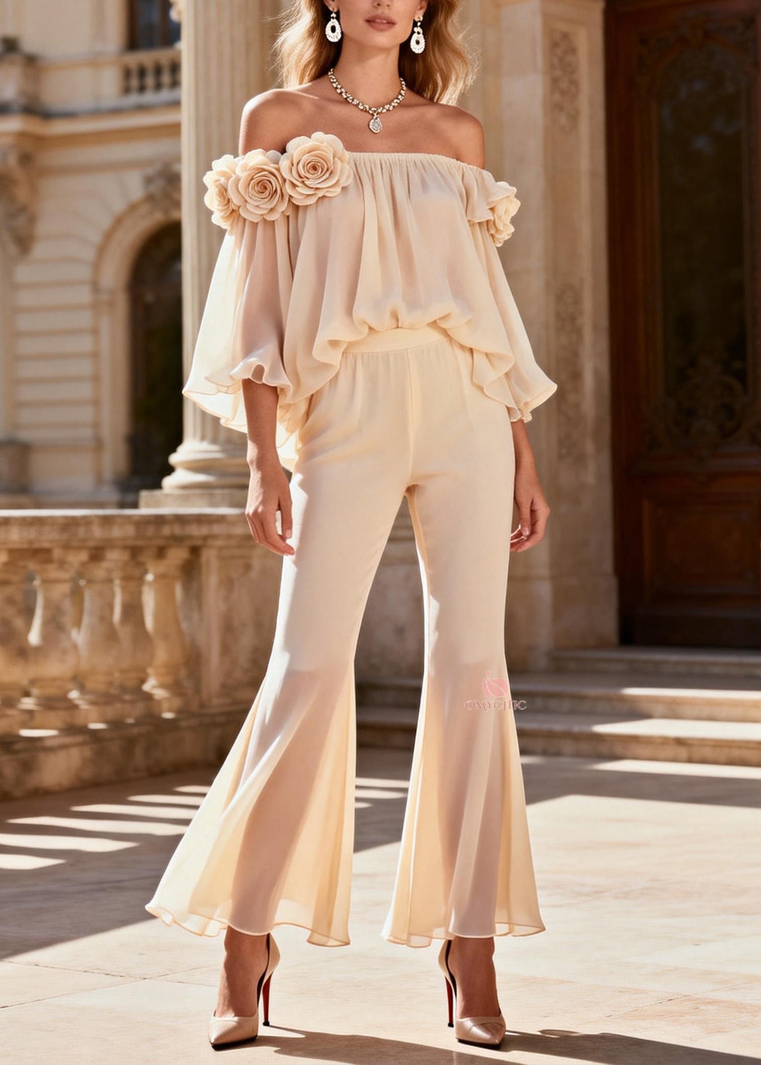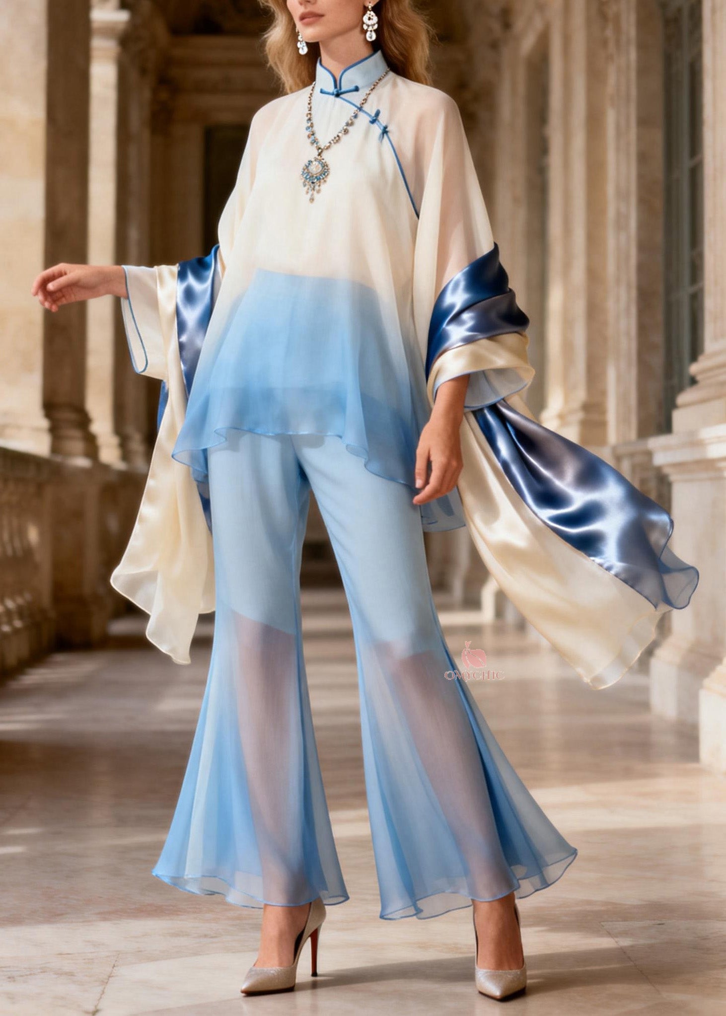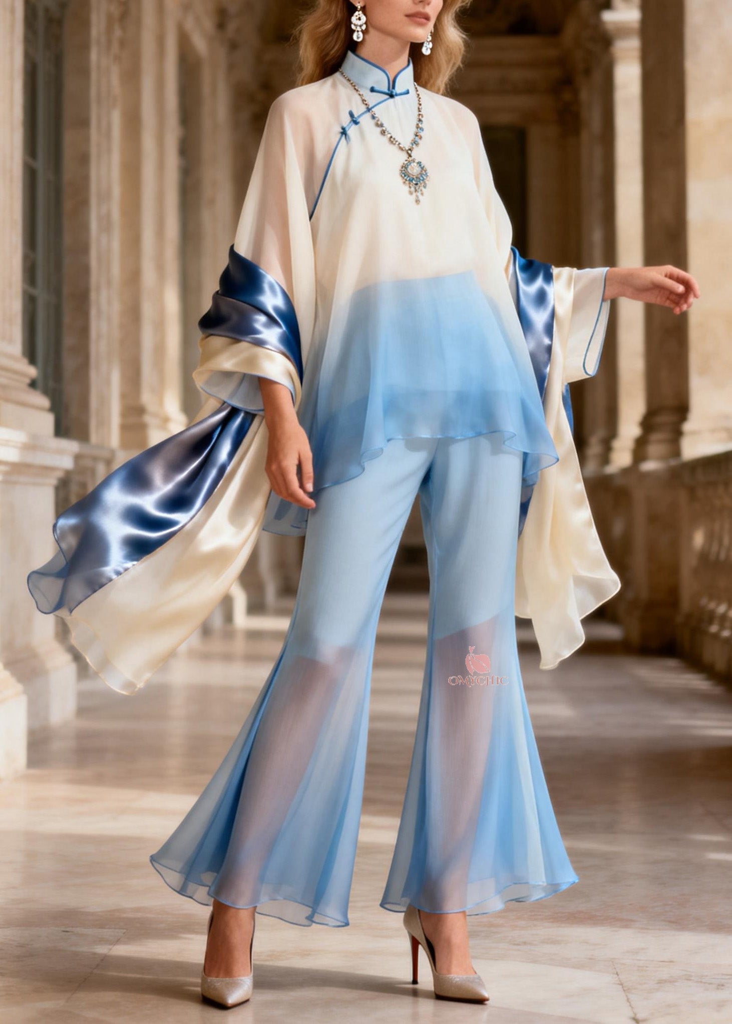 Gradient Color Slash Neck Print Chiffon Top And Flared Trousers Two Pieces Set Long Sleeve