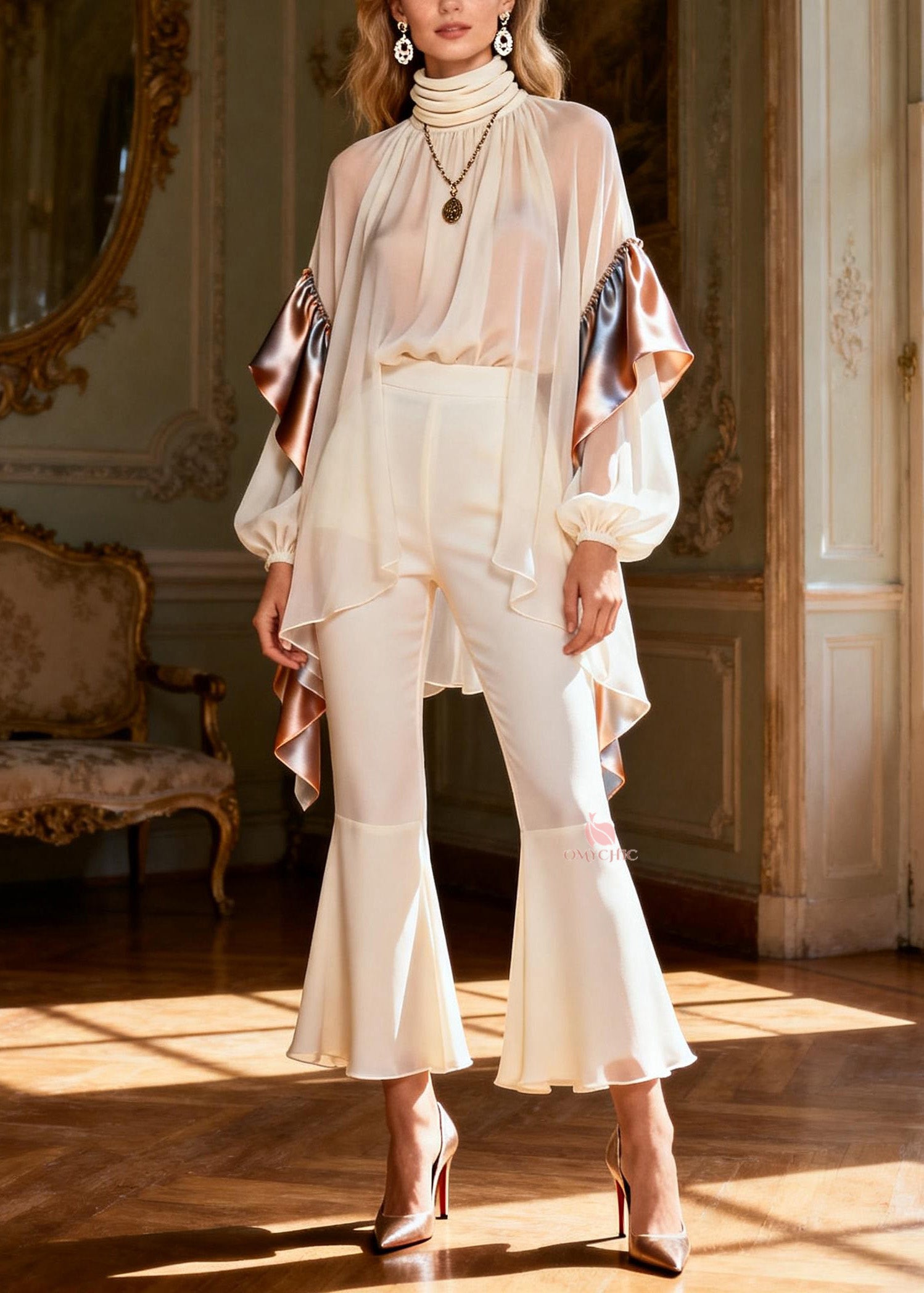 Art Neck Patchwork Silk Top And Flared Trousers Two Pieces Set Lantern Sleeve
