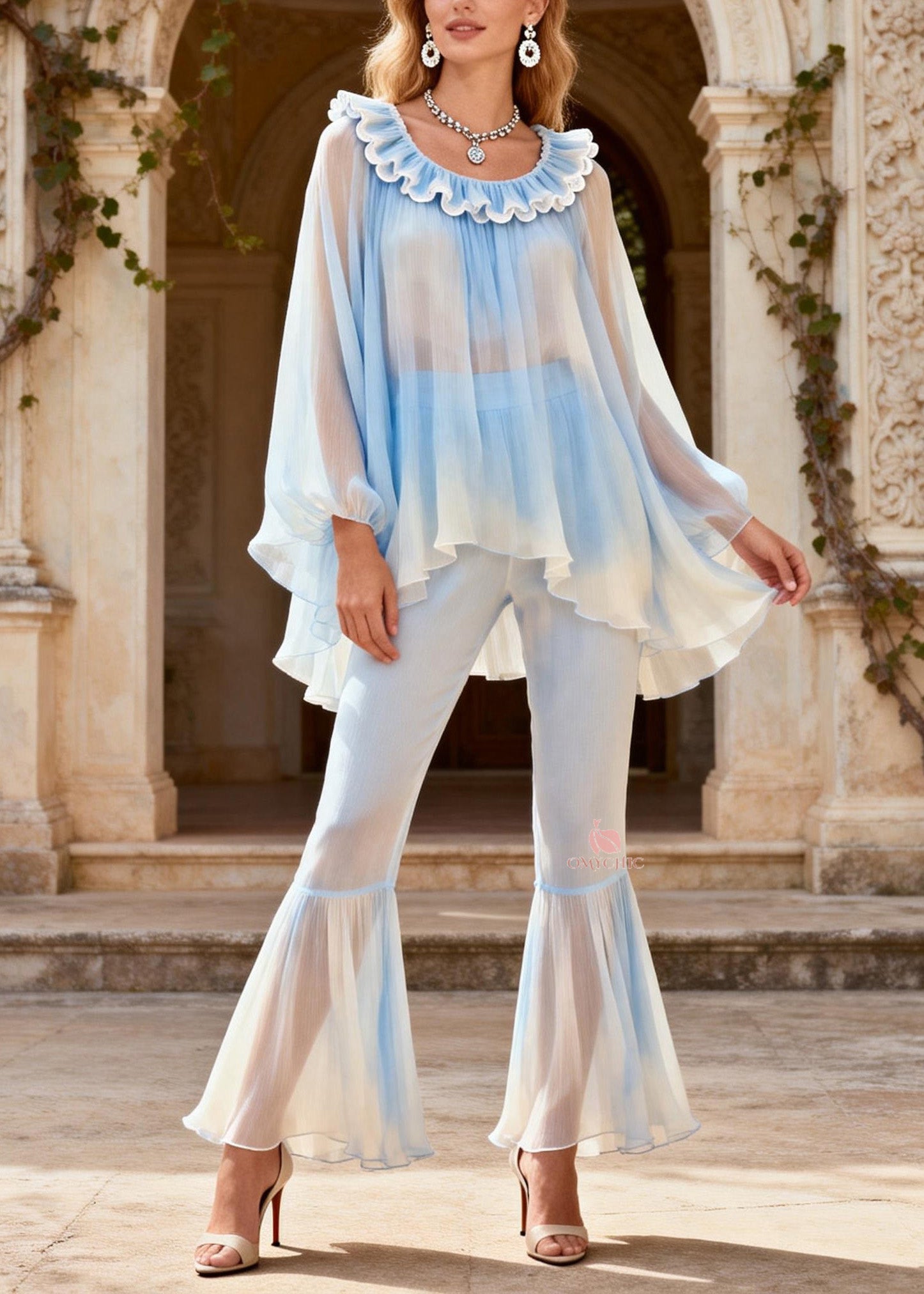 Boho Blue Wrinkled Silk Top And Flared Trousers Two Pieces Set Spring