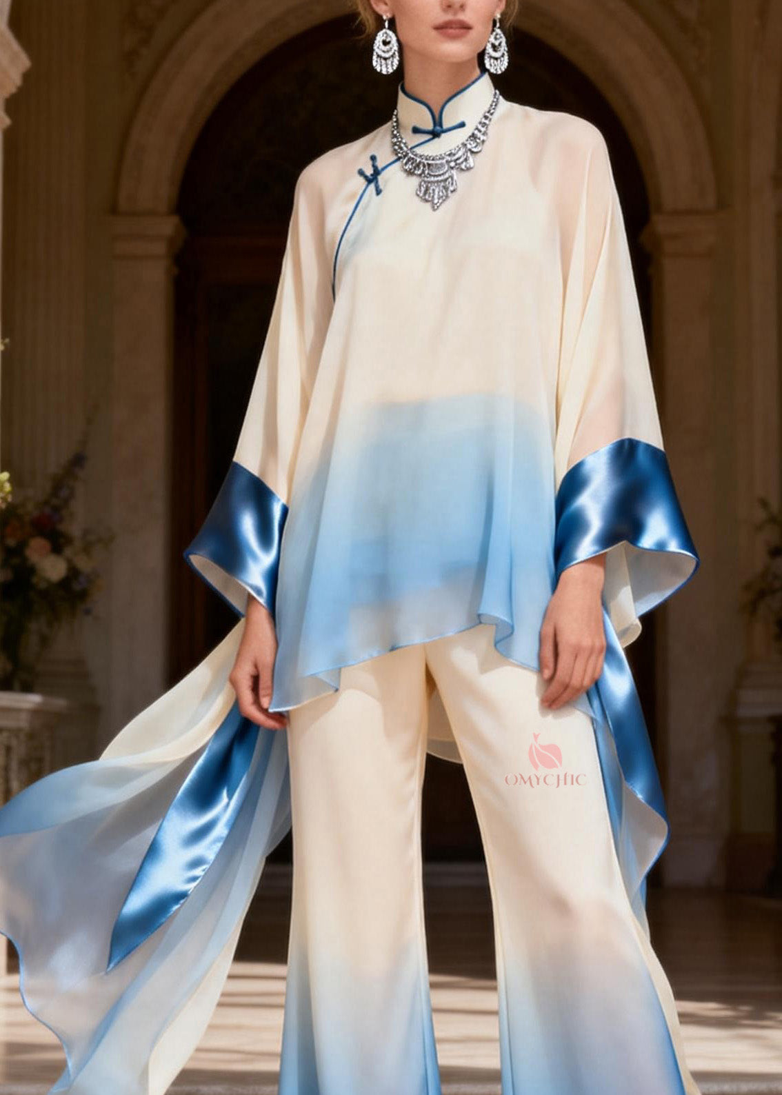 Chinese Style Stand Collar Silk Shirts And Flared Trousers Two Pieces Set Spring