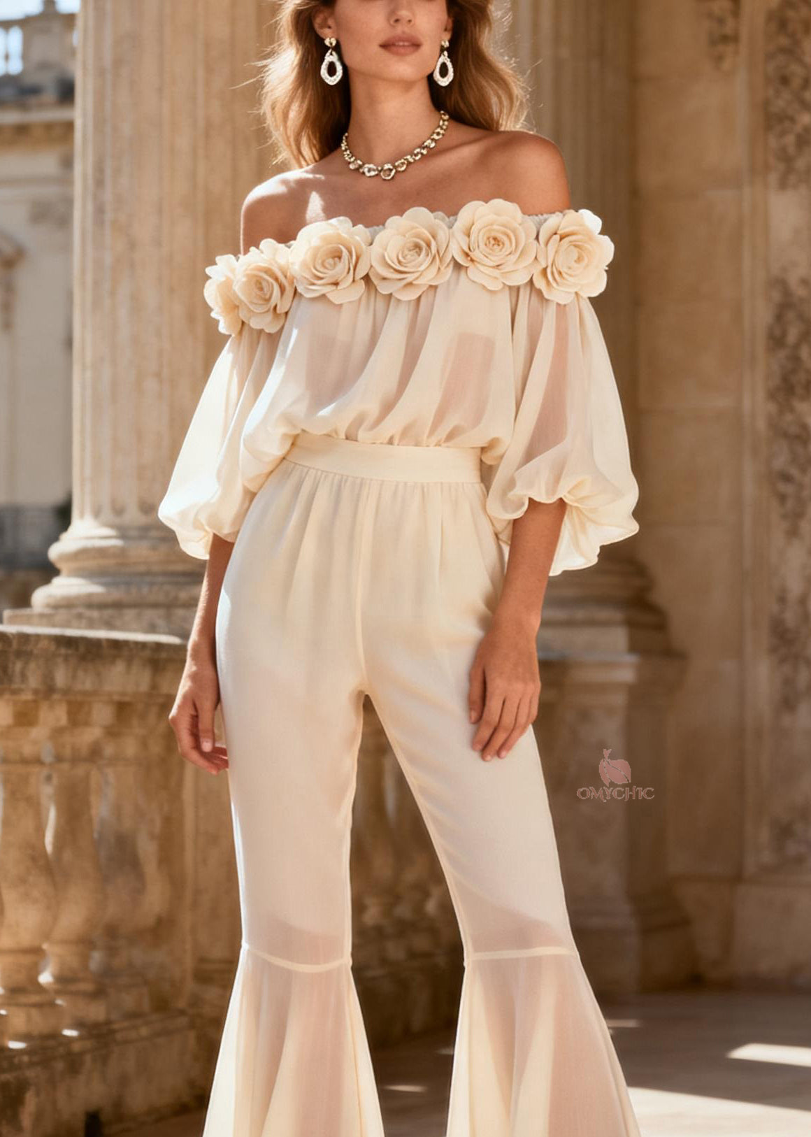 Fashion Beige Cold Shoulder Floral Silk Two Pieces Set Summer