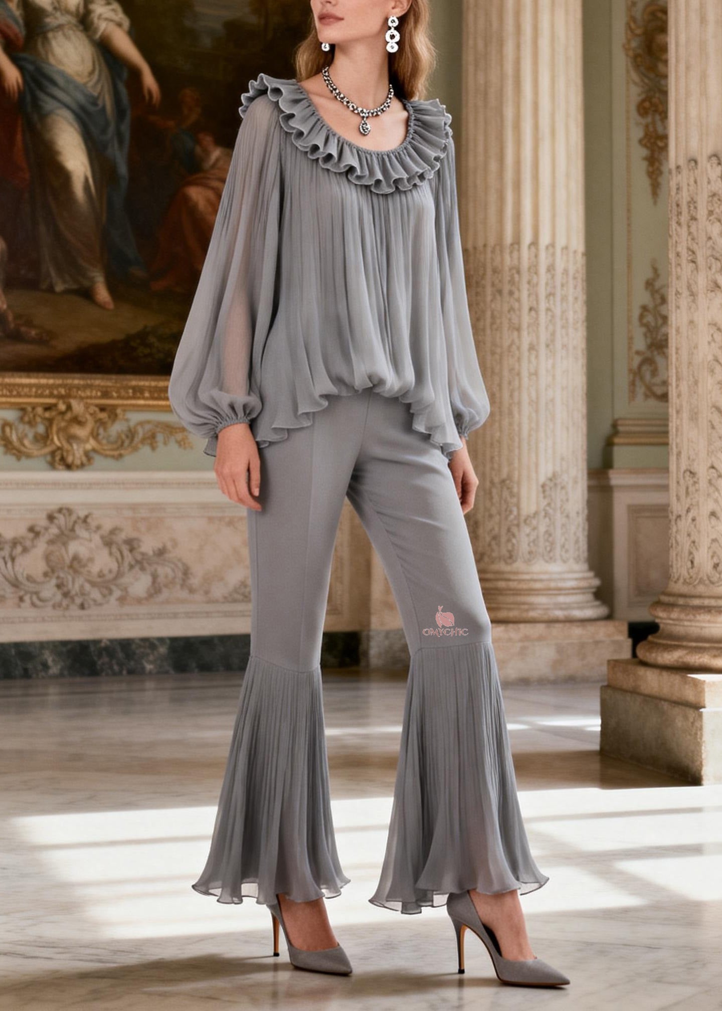 Women Grey Ruffled Patchwork Linen Silk 2 Piece Outfit Spring
