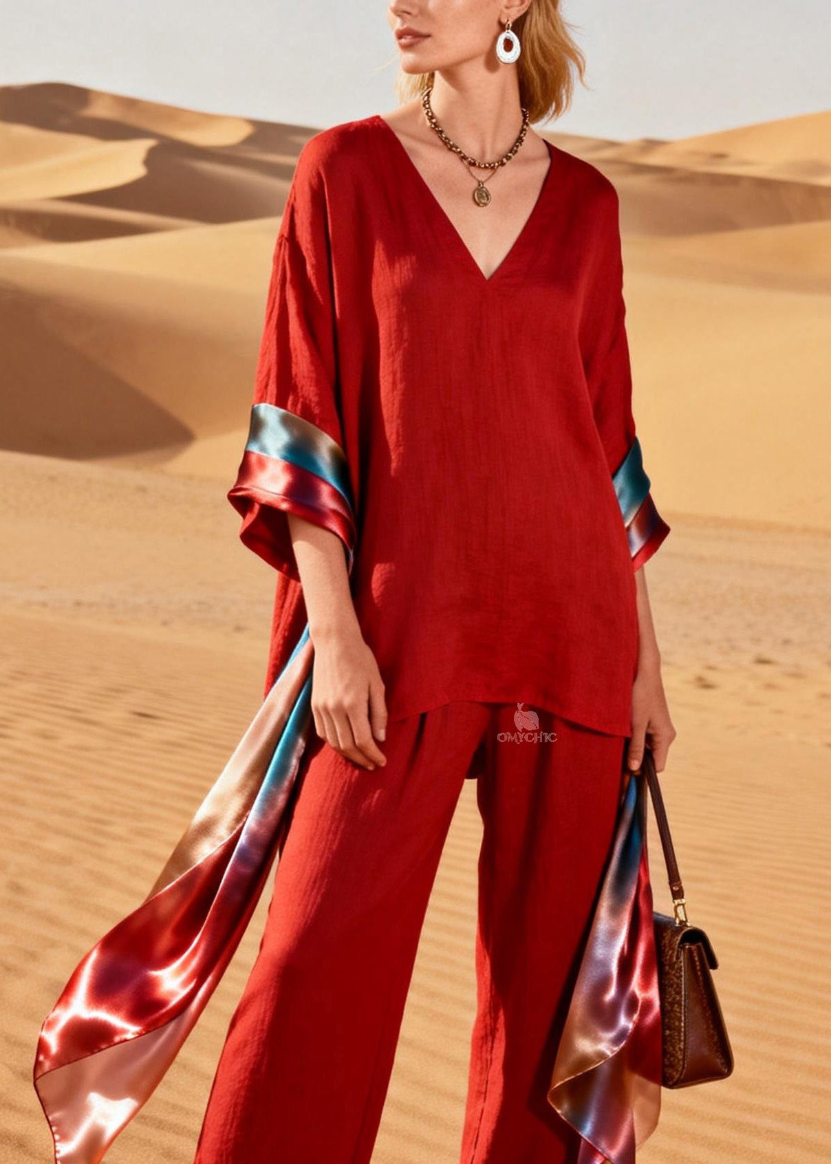 Handmade Red V Neck Patchwork Linen Silk Two Piece Set Women Clothing Summer