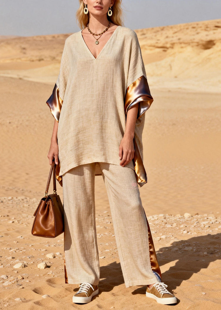 Loose V Neck Patchwork Linen Silk Two Pieces Set Summer