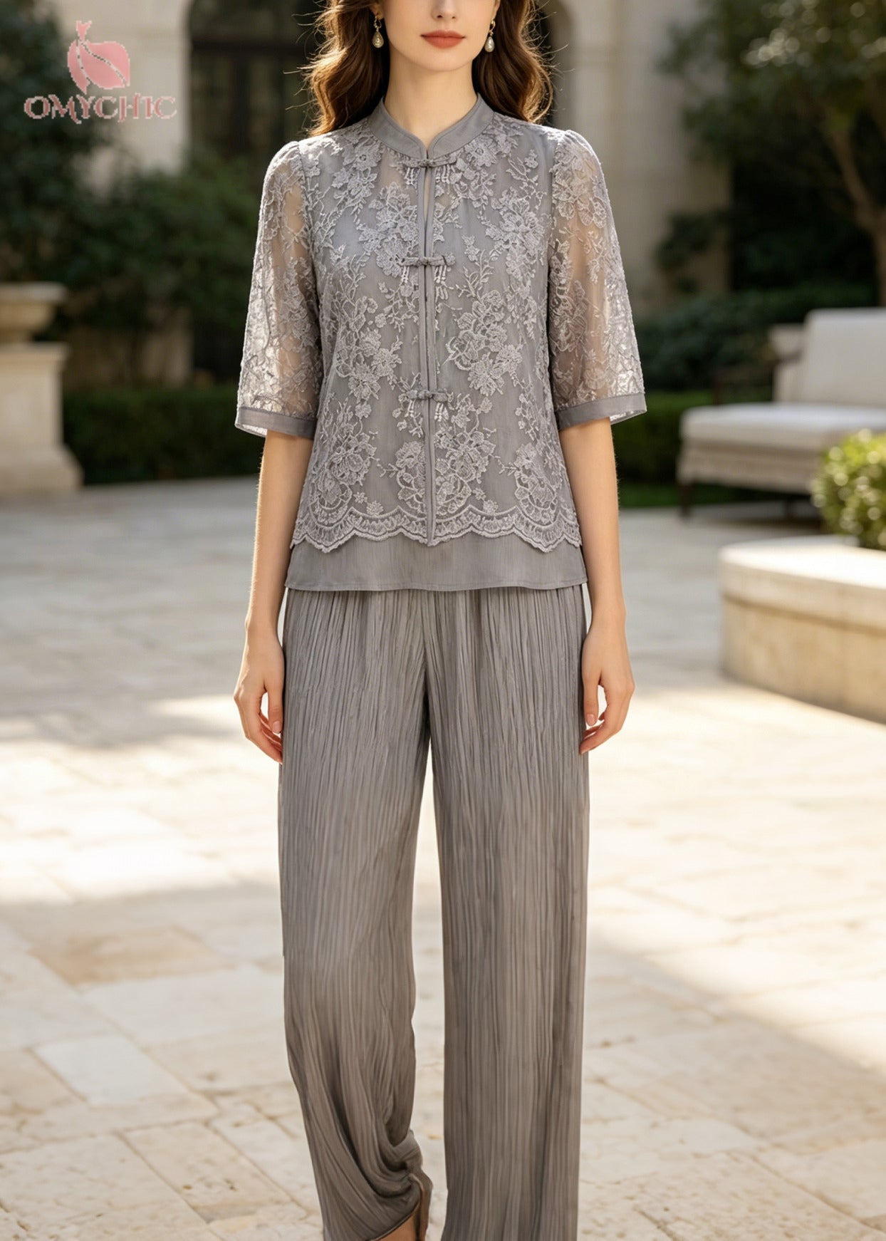 Art Grey Mandarin Collar Patchwork Lace Two Piece Set Outfits Summer