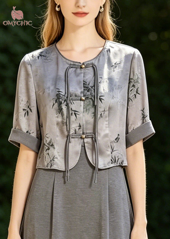 Fine Grey Tasseled Print Silk Oriental Dresses Two Piece Set Summer
