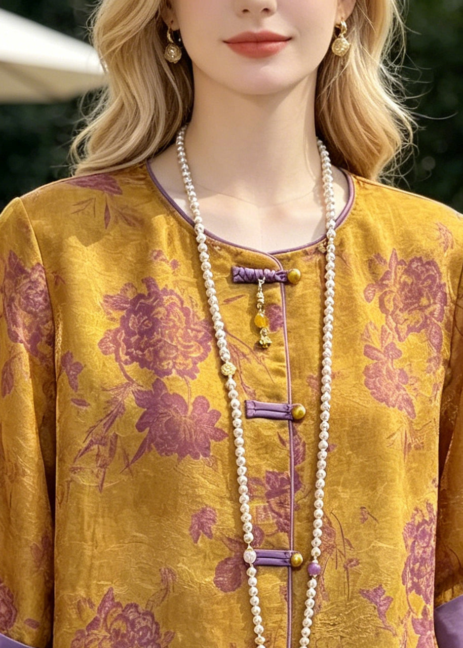 Retro Golden Jacquard Chinese Button Silk Top Half Sleeve
