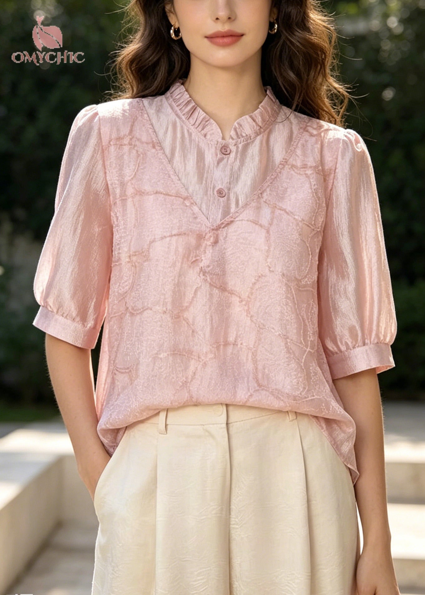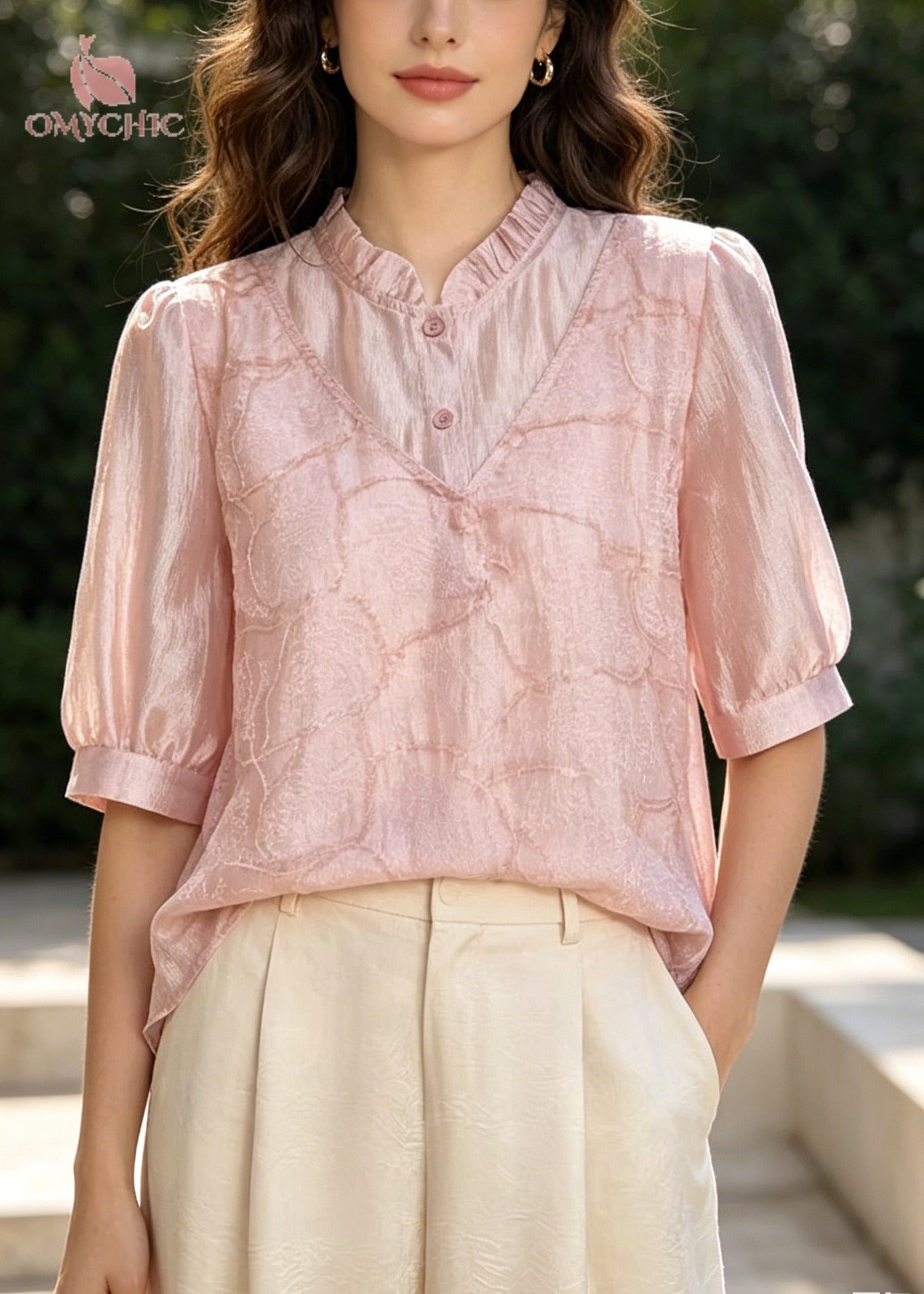 Style Pink Embroidered U Neck Silk Fake Two Piece Shirt Top Summer
