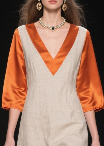 Fitted Beige Asymmetrical Patchwork Linen Silk Fake Two Piece Dresses Summer