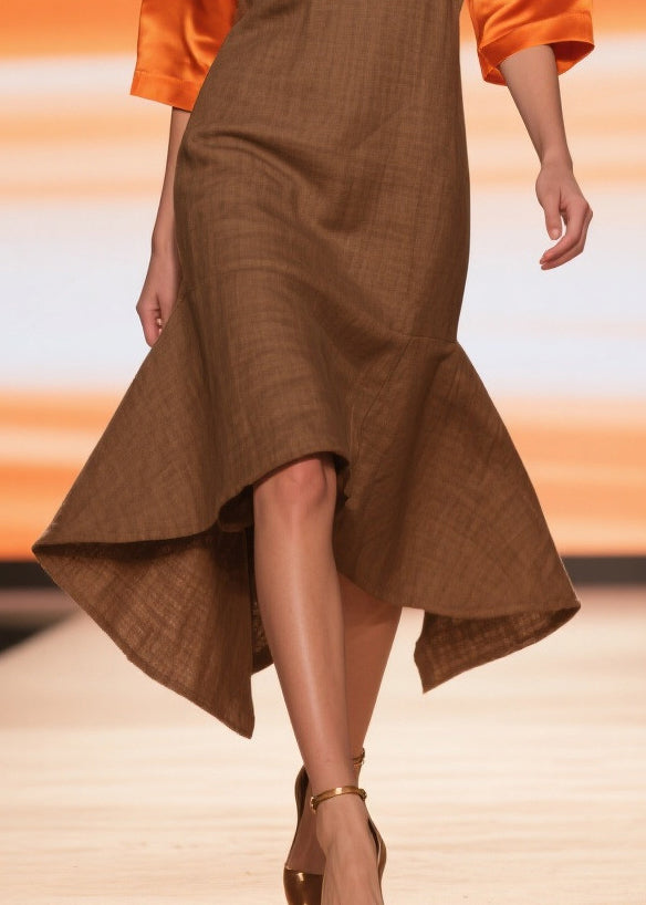 French Chocolate V Neck Patchwork Linen Silk Robe Dresses Summer