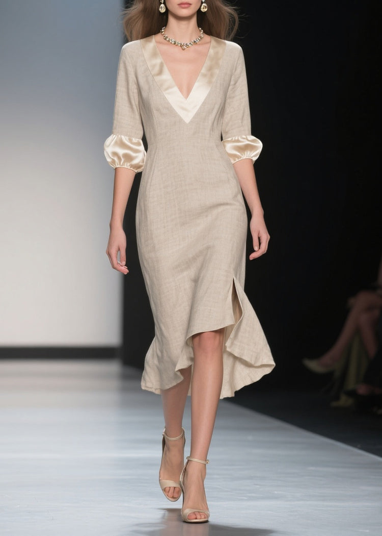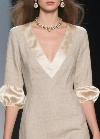 Italian Beige V Neck Patchwork Linen Silk Dresses Lantern Sleeve