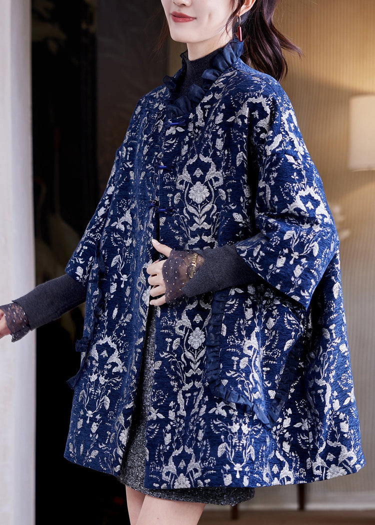 Jacquard Navy Blue Pockets Thick Coat Three Quarter Sleeve Sleeve