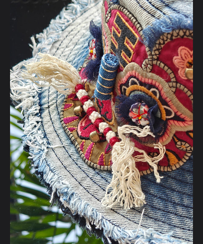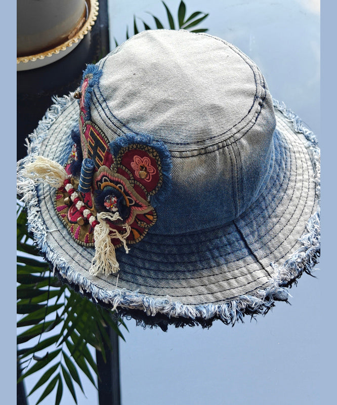 Chinese Style Light Blue Embroidered Denim Bucket Hat