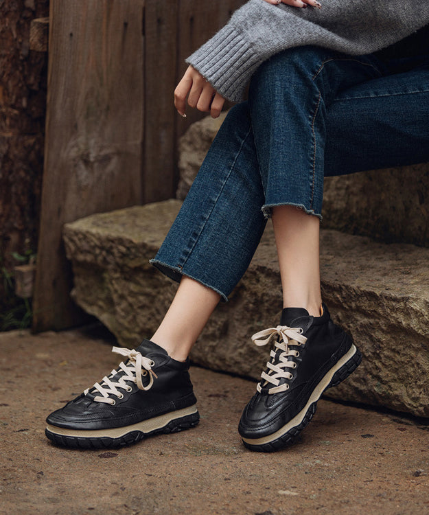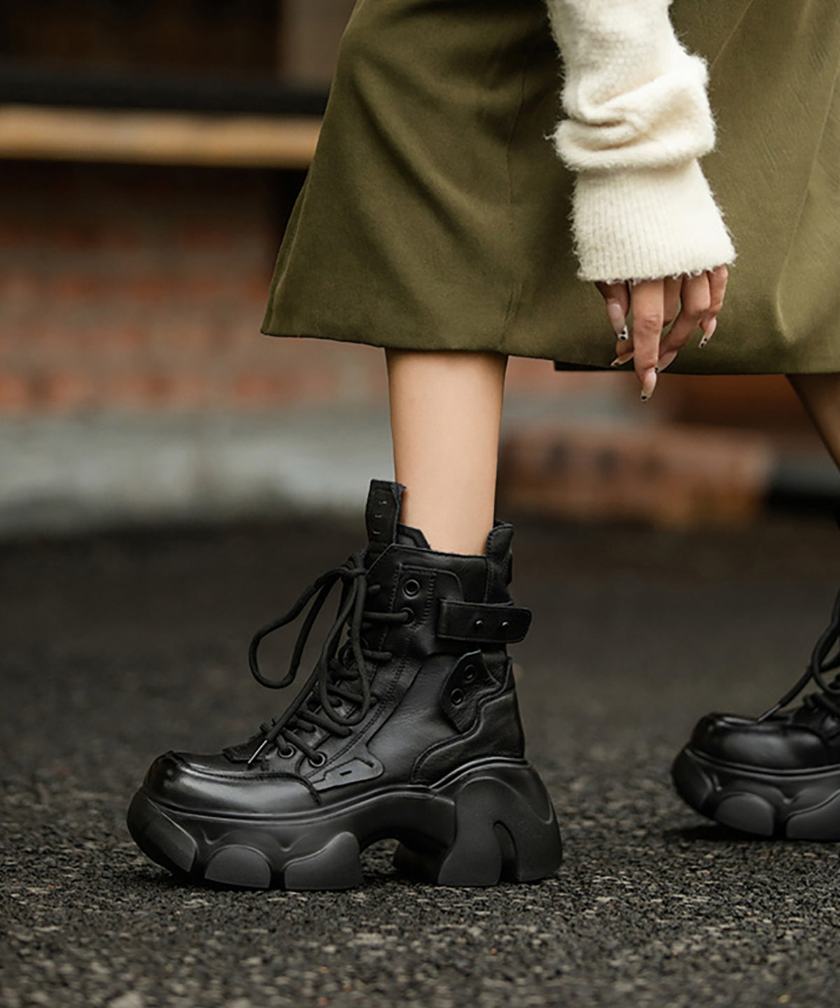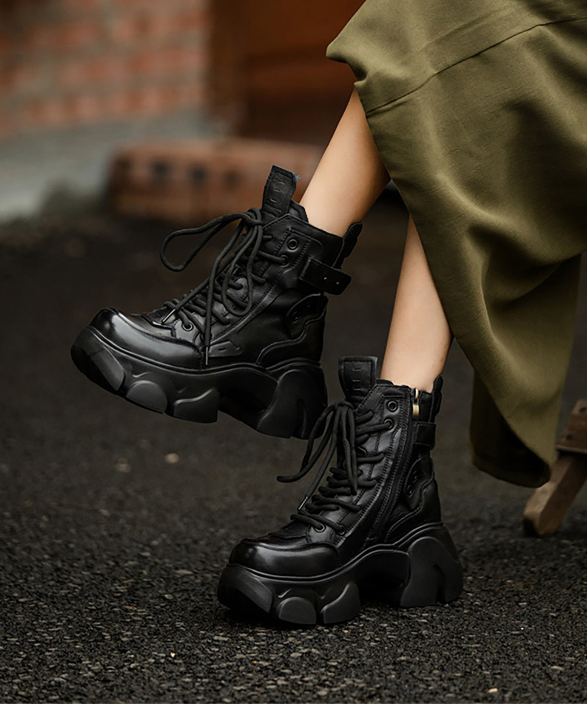Unique Black Zippered Splicing Platform Cowhide Leather Boots