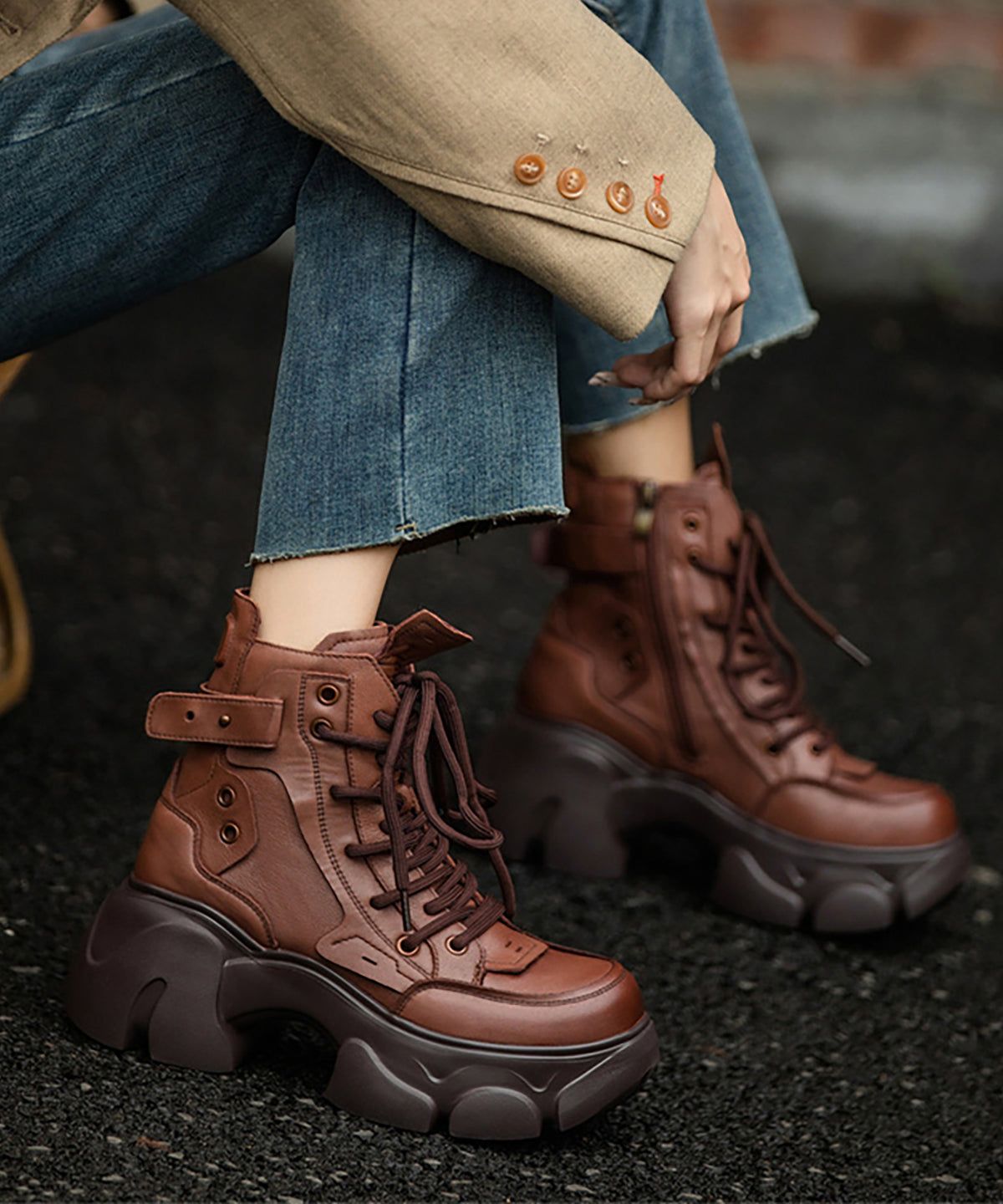 Brown Boots Platform Cowhide Leather Casual Splicing Fuzzy Wool Lined